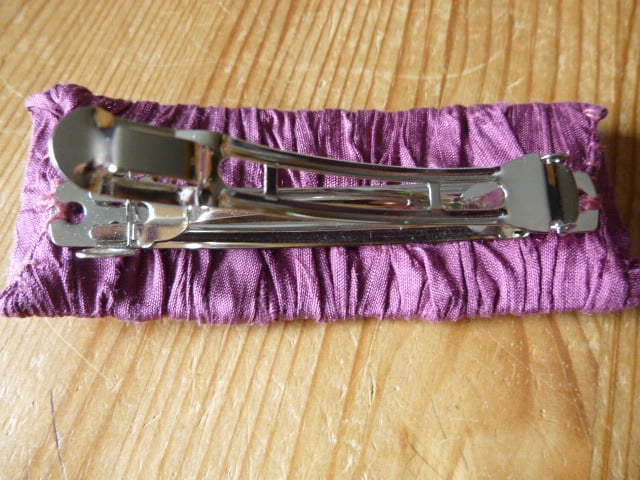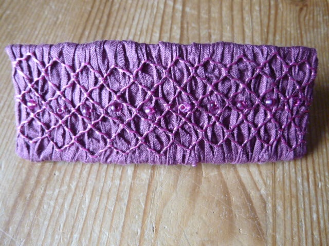 This attractive hair clip features a rich band of hand smocked Dupion silk, further embellished by a row of tiny matching glass beads attached down the centre for added sparkle.