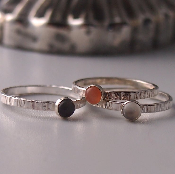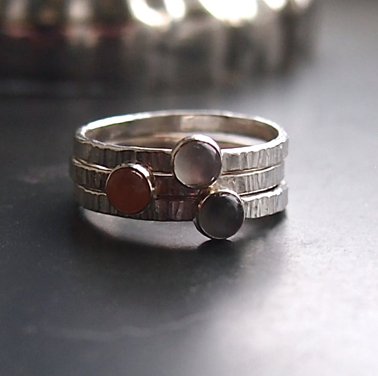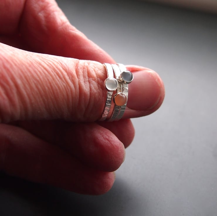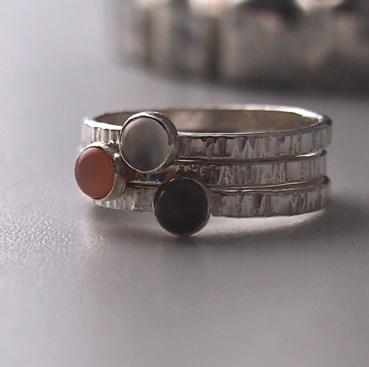 Three sterling silver textured rings with a trio of natural moonstones. Beautiful shades of peach, white and deep grey all with the moonstone soft shimmer over the surface. The bands are individually textured and are 2mm deep.