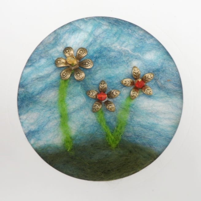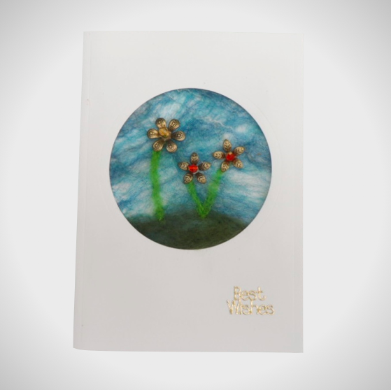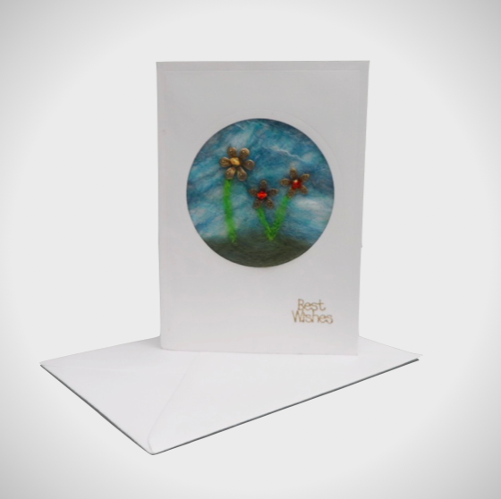 A beautiful handmade greetings card or notelet suitable for any occasion. This 6" x 4" (15cm x 10cm) card has a circular aperture into which a pice of nuno felted silk, embellished with needle felting and beaded flowers to create a floral design, has been placed. The result is a totally unique card. A greeting of "Best Wishes" in gold has been added while the inside of the card has been left blank for your own message. The card is supplied with a white envelope and wrapped in a protective cellophane bag.
