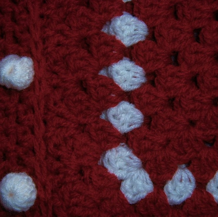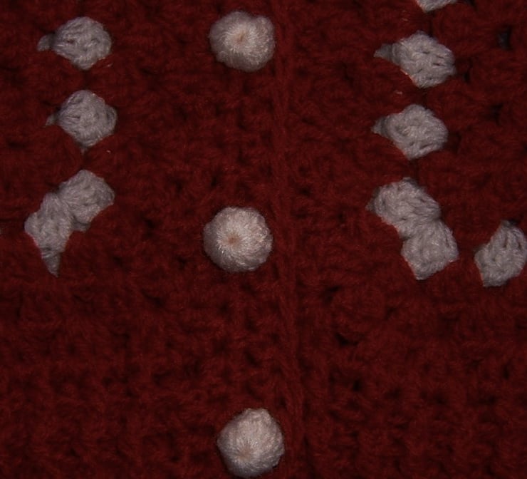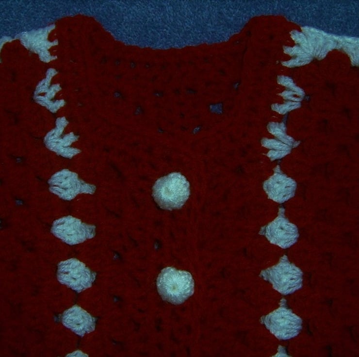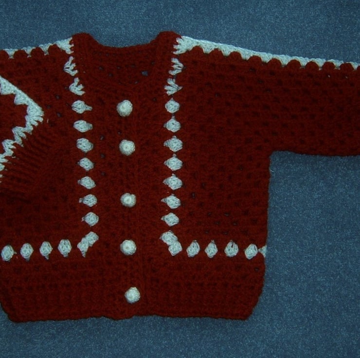 This lovely hand crocheted child's cardigan has been created in a DARK burgundy(maroon) and white acrylic double knitting yarn.