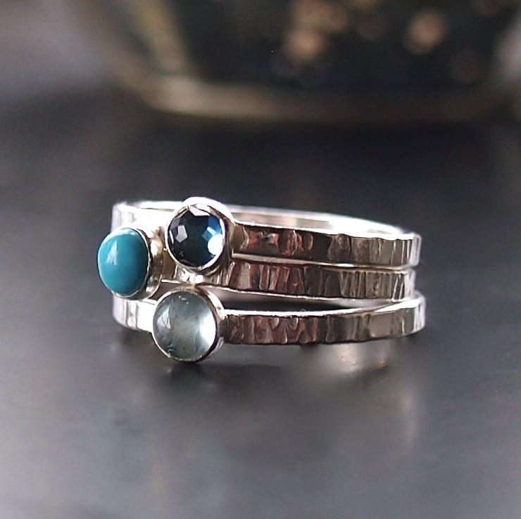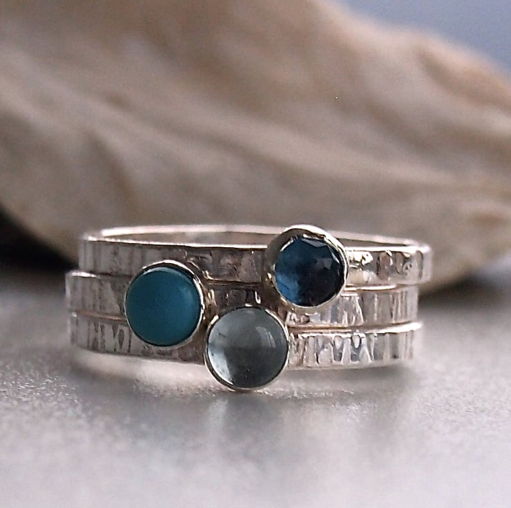Three sterling silver textured bands are set with a trio of aqua toned semi precious stones. Turquoise, a rich faceted blue topaz and a sky blue topaz make a perfect summer threesome. The bands measure 2mm and are individually hand textured. The stones are all 4mm.