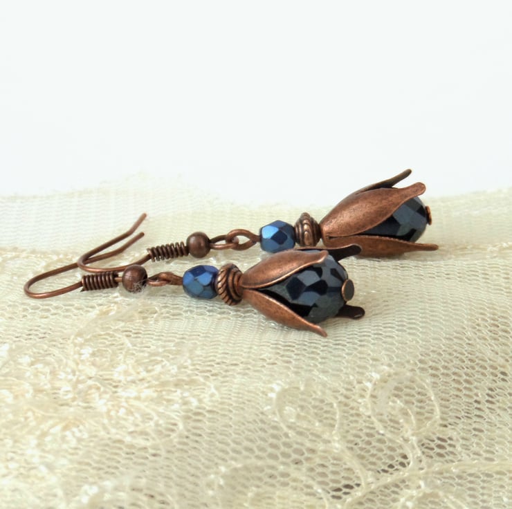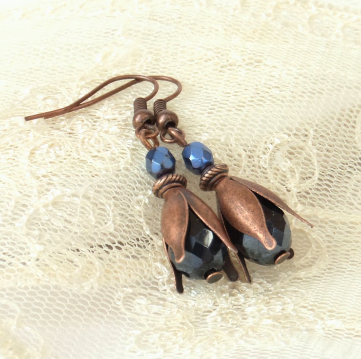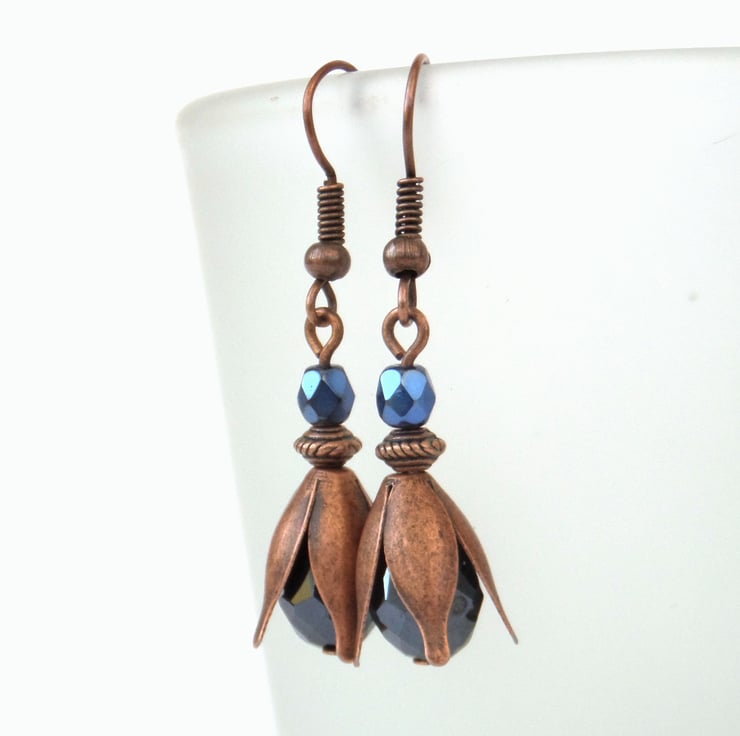 Stunning jet blue beads encompassed in copper 'petals' with rich blue crystal hang from copper wires to make these flower-style earrings. An ornate copper rondelle provides the finishing touch.