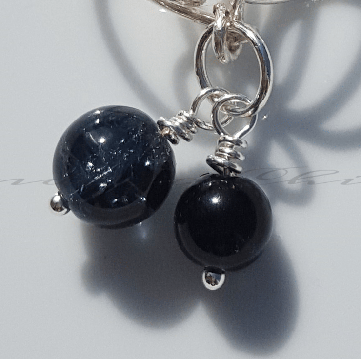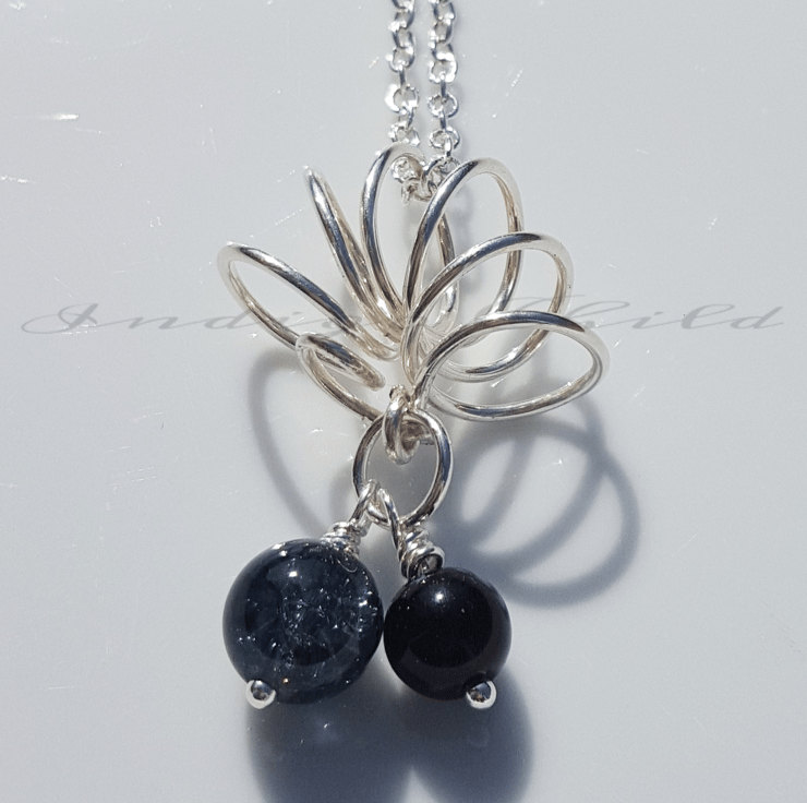 A lovely unique pendant made by twisting silver plated 1.2mm beading wire. I then used two silver plated metal ball head pins through each bead (one 10mm dark blue glass crackle bead and one 8mm black glass pearl bead). The head pins have been wrapped at the top with a loop and attached to the pendant.