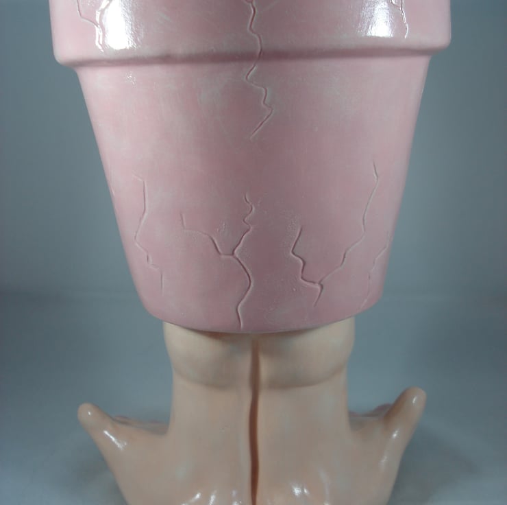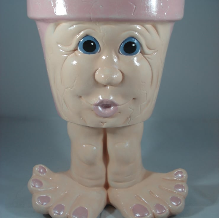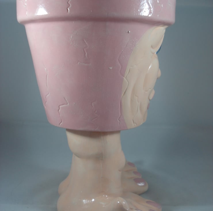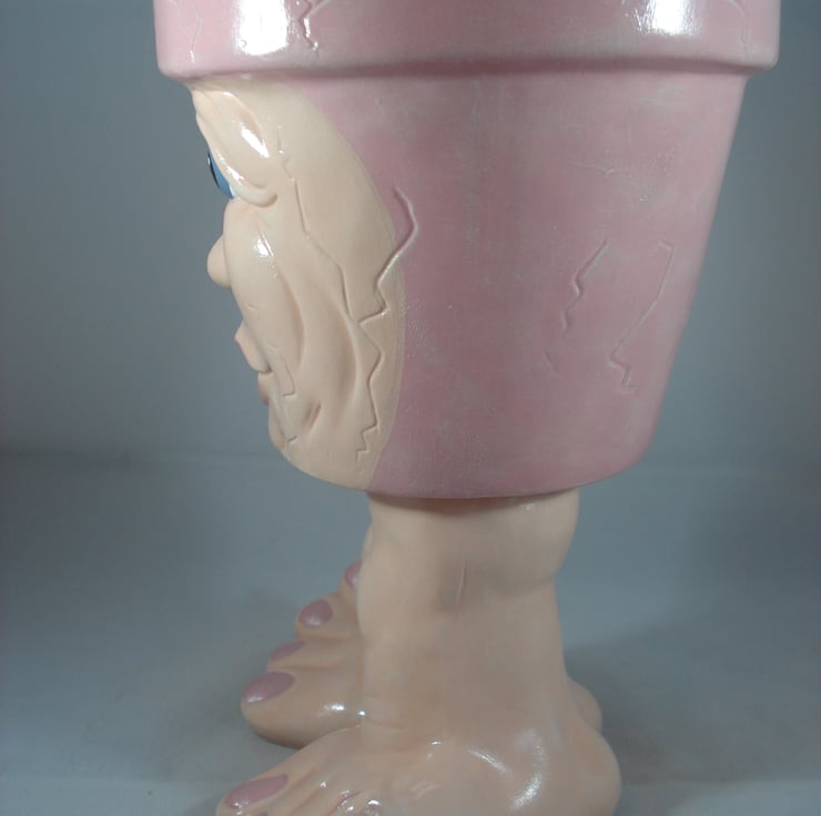 I have for sale a novelty ceramic plant pot, which was hand painted by myself. The pot is in a pretty pink colour, with a lovely face on the front of it, standing on a pair of legs and feet. It has no drainage holes in the bottom, so it could be used indoors or out. This would make a lovely addition to anyone's garden or home, or perhaps given as a gift.