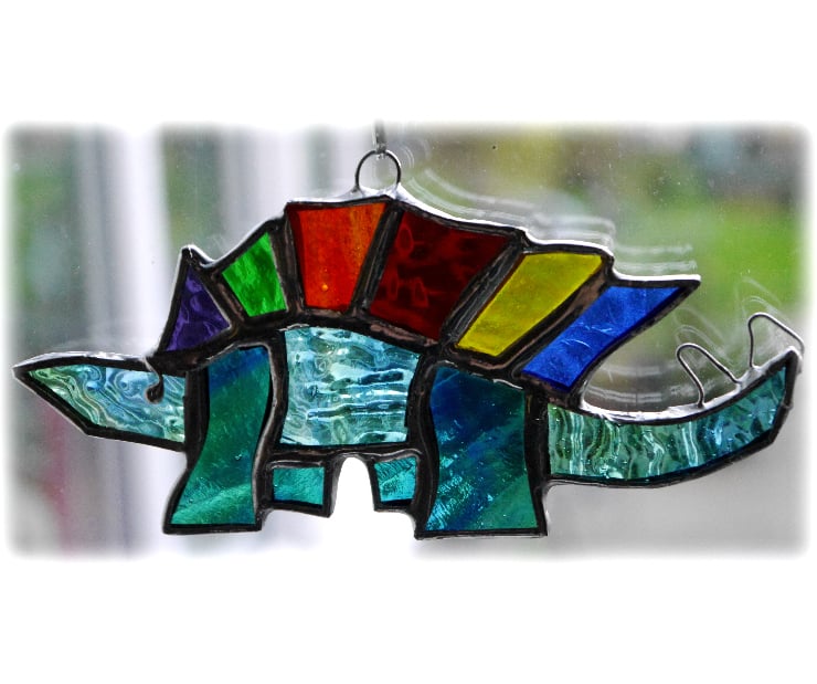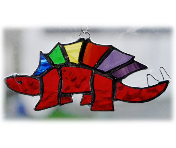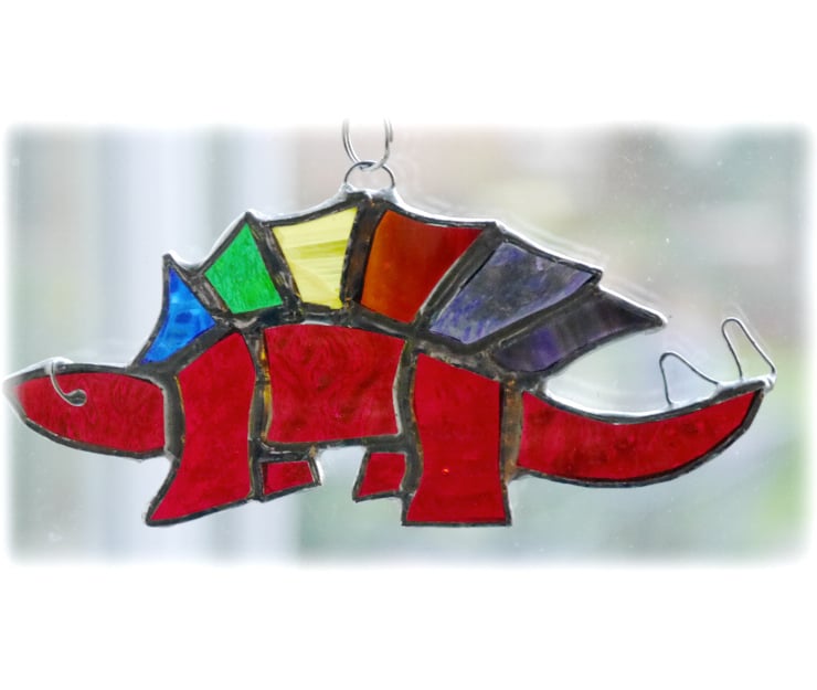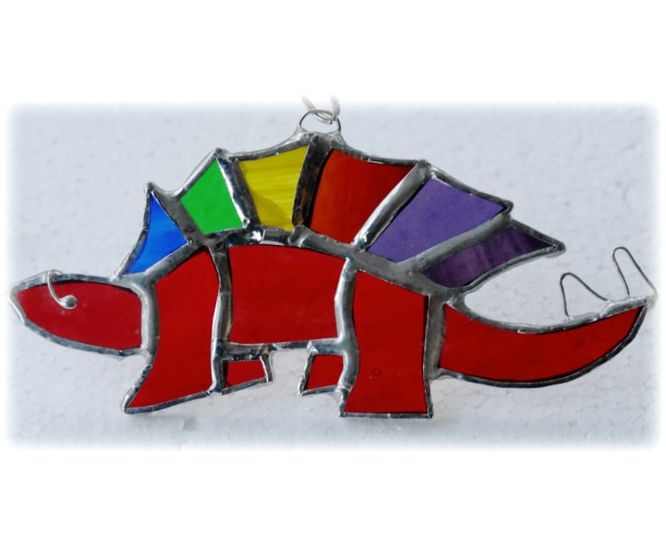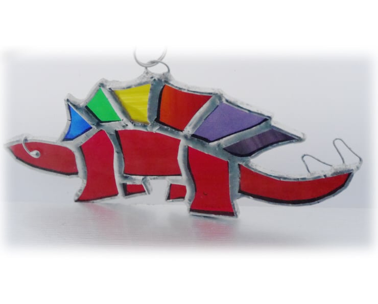 This is a dinosaur, a Stegosaurus - with a bright red body and a back fin in 6 different shades and textures of glass which together make up the full range of rainbow colours.