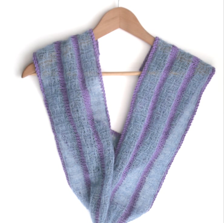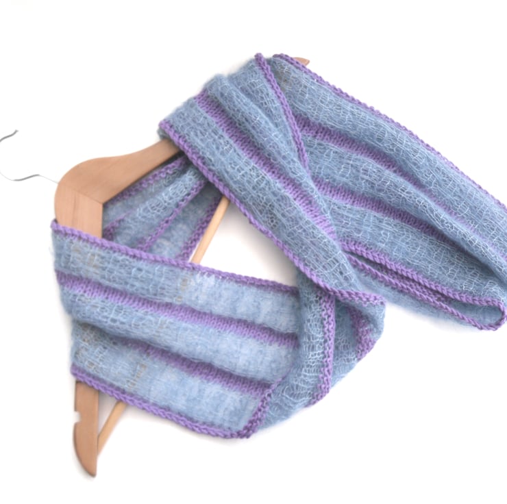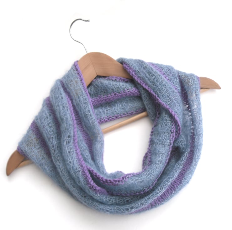 Striped cotton / mohair cowl. Hank knit in an intricate open lacework in a soft blue kidsilk yarn (70% mohair / 30% silk), a light , delicate and fluffy mohair / silk mix yarn. Striped with 100% cotton yrn in a lovely shade of purple.