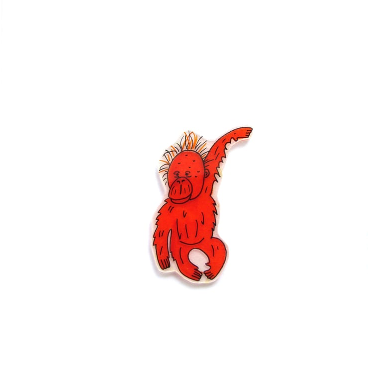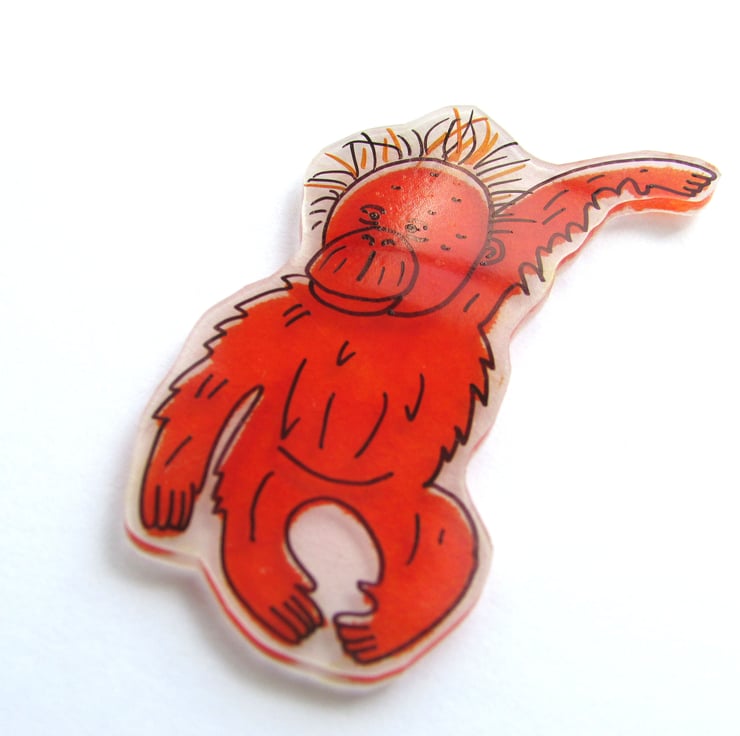The orangutan has been hand drawn on to frosted shrink plastic, coloured and lightly varnished. On an A6 white card with envelope.