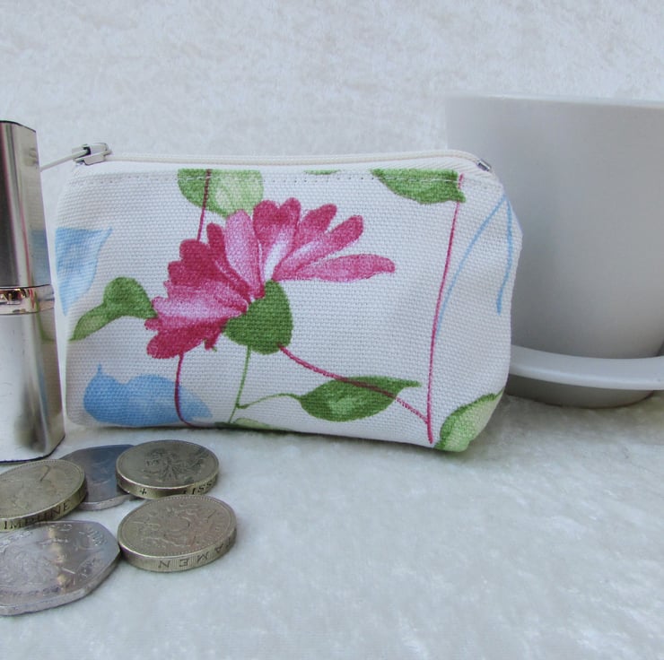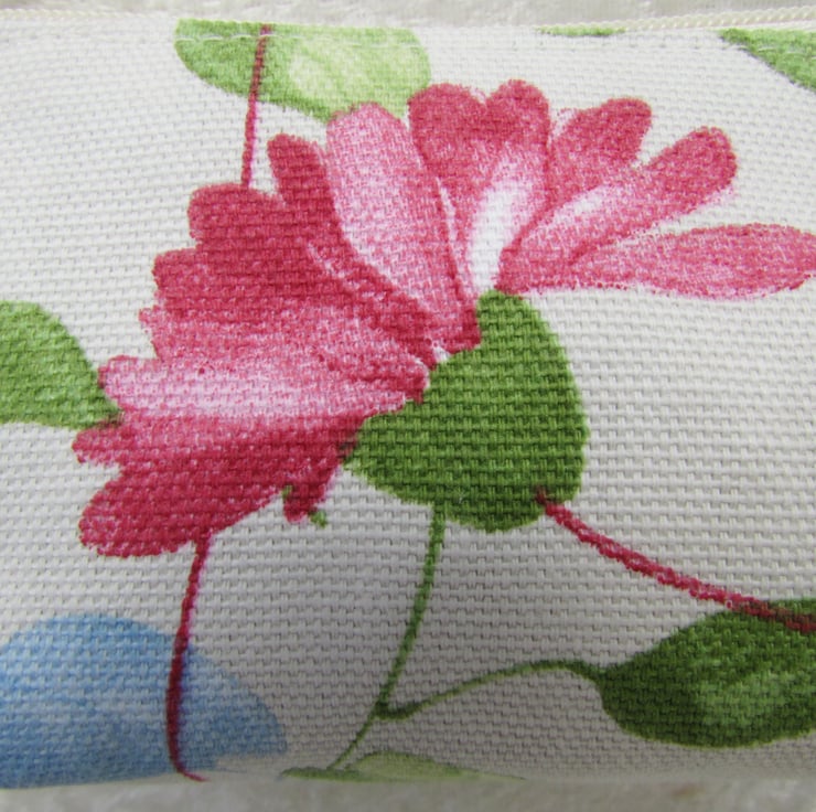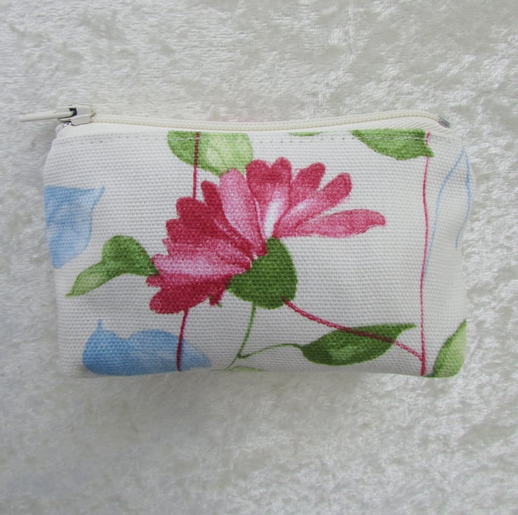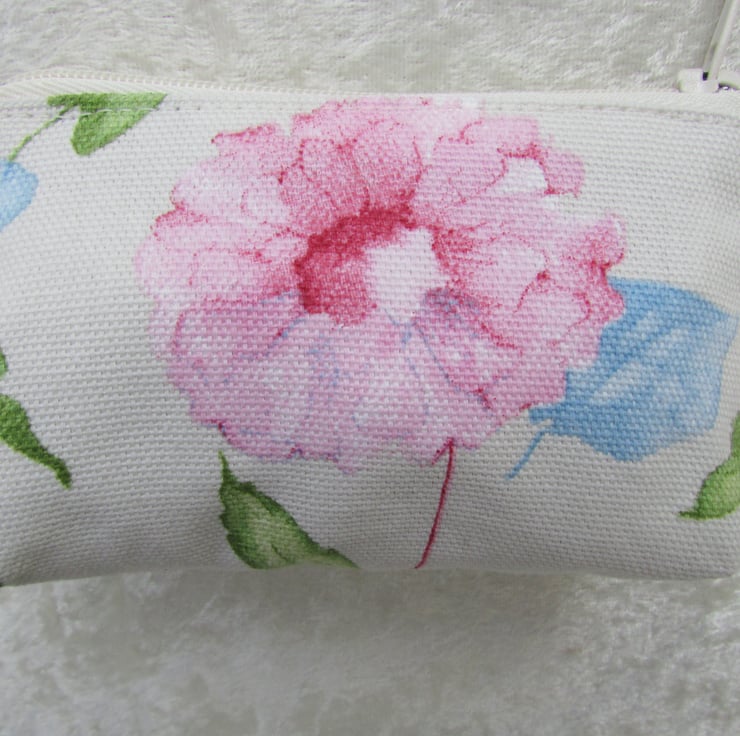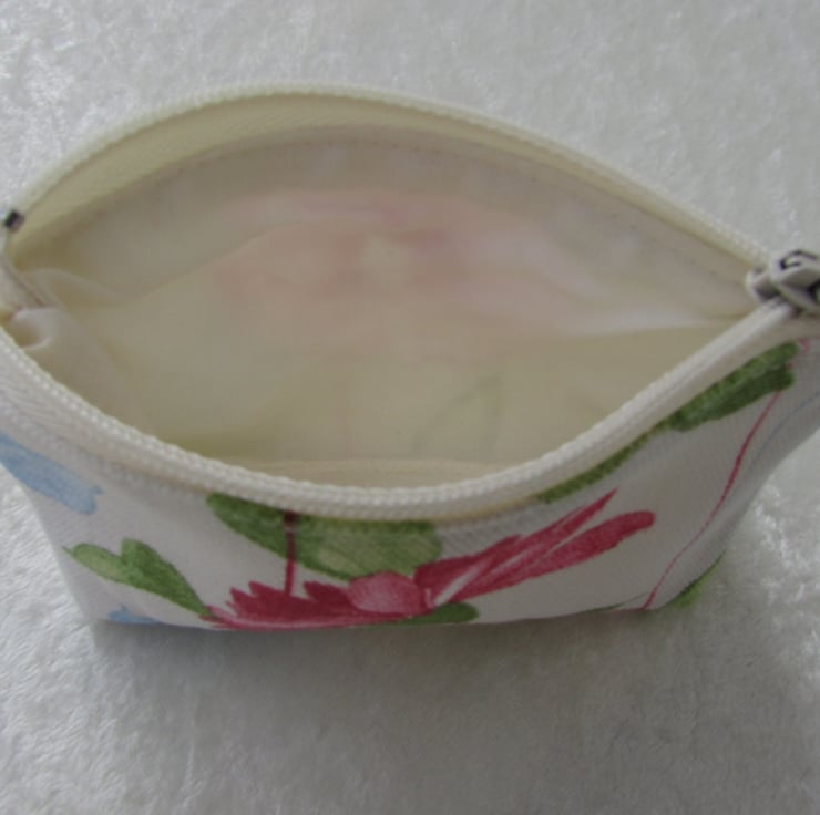 A delightful little purse in a cream fabric with a pretty pastel floral print pattern in pink, blue and green. The purse is fully lined with cream fabric and has a zip fastening. The base of the purse is boxed for a more spacious interior.