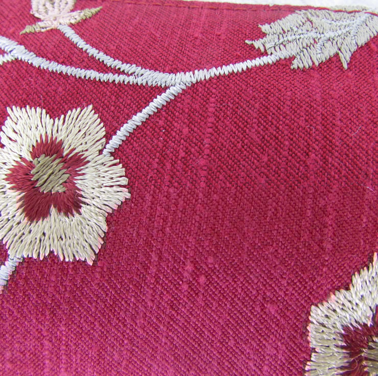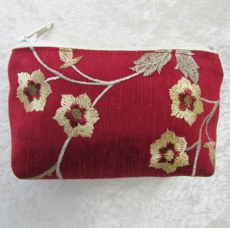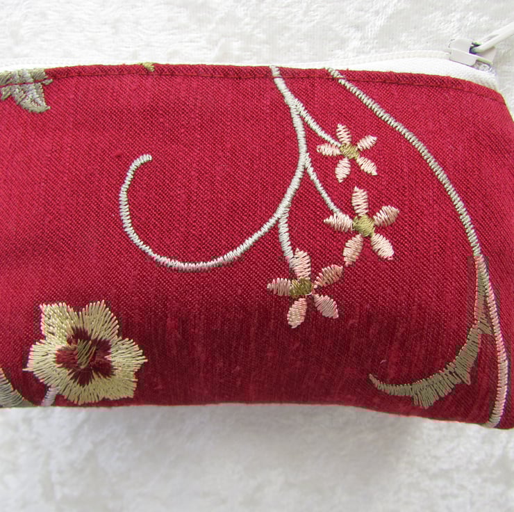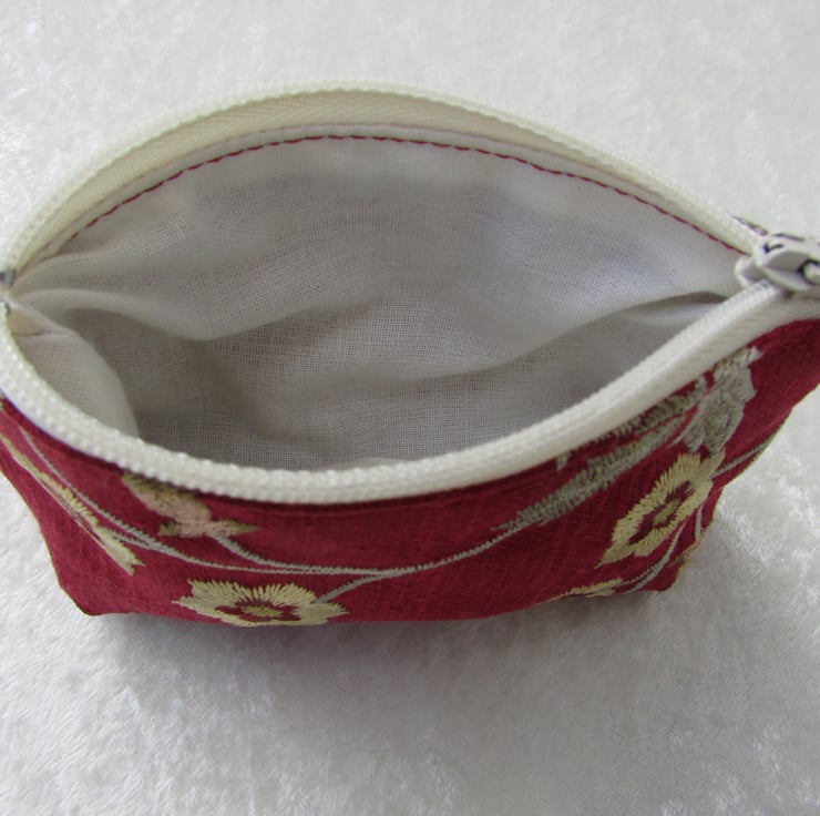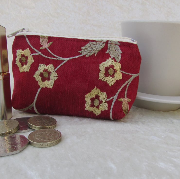 A pretty little coin purse in a lovely red fabric with a beautiful embroidered floral pattern in lemon yellow and green. The purse has a zipped opening and the base is boxed to give plenty of room inside. The inside of the purse is lined with cream fabric.