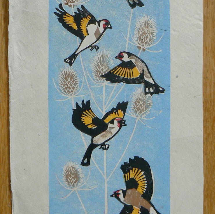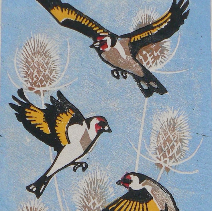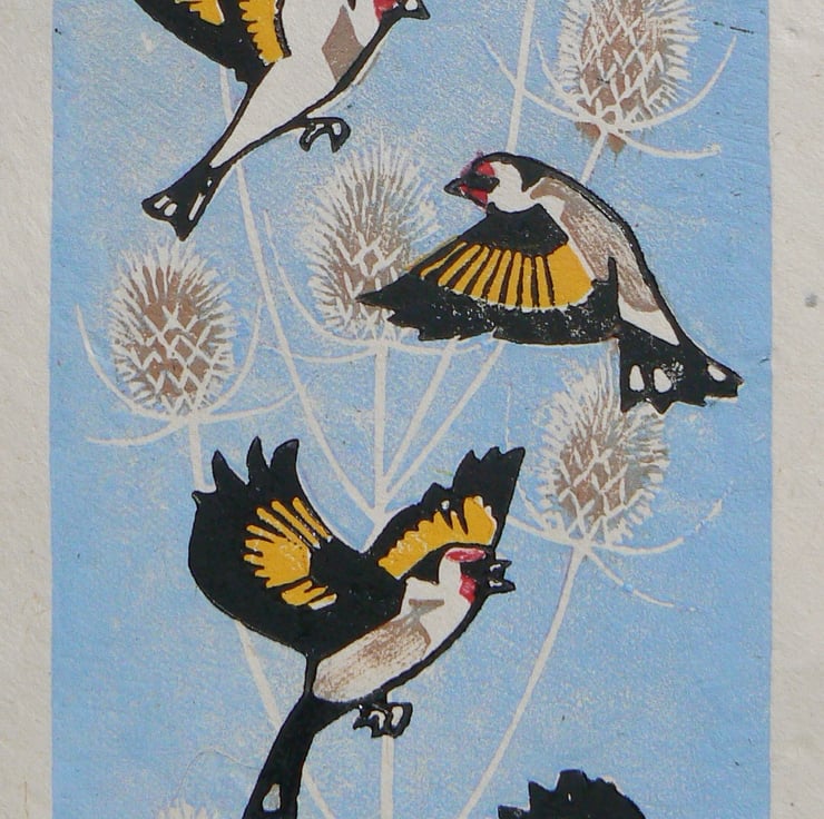 Jane really enjoyed studying birds in flight for several new designs in 2016-2017, and this was her most colourful to date. Goldfinches come in to our garden for the sunflower seeds we put out for them, but when I'm out walking, they are flocking round the teasels for their lunch.