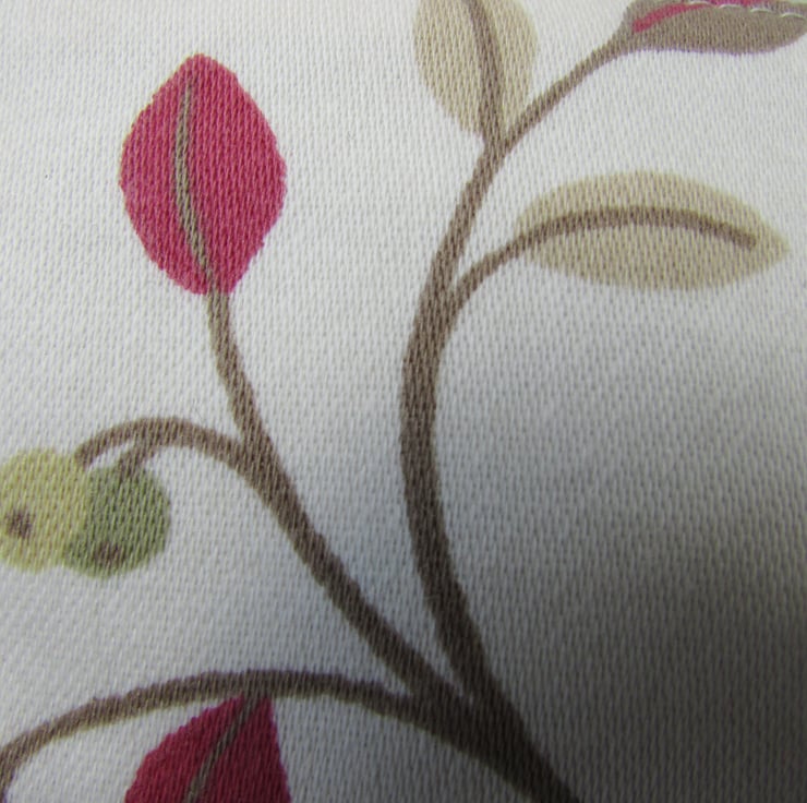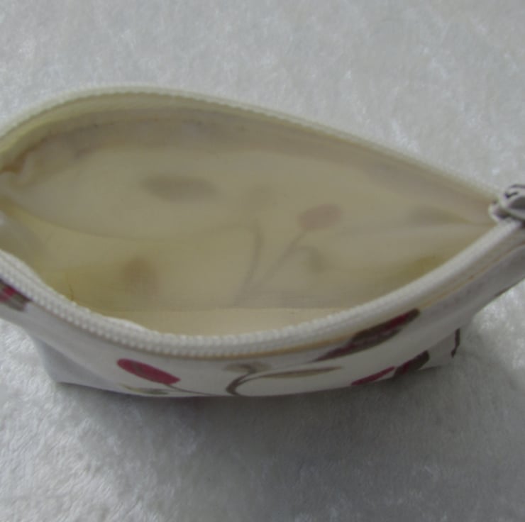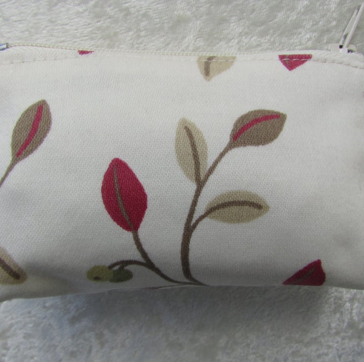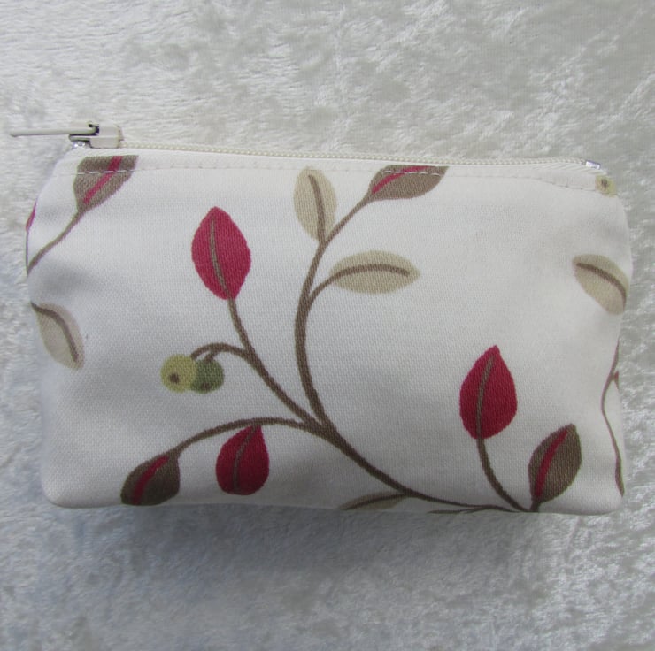 A cute zipped purse in cream fabric with a delightful print pattern featuring leaves and berries in red, beige and green. The purse is fully lined with cream fabric and has a zipped opening. The base of the purse is boxed to give plenty of space inside.