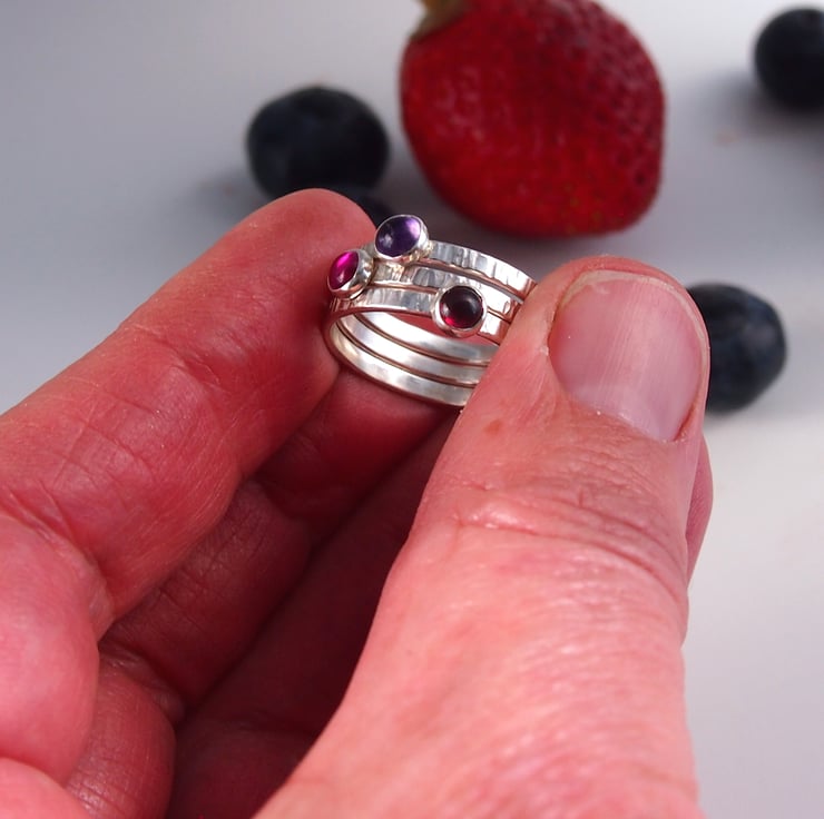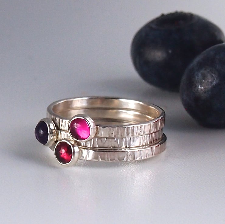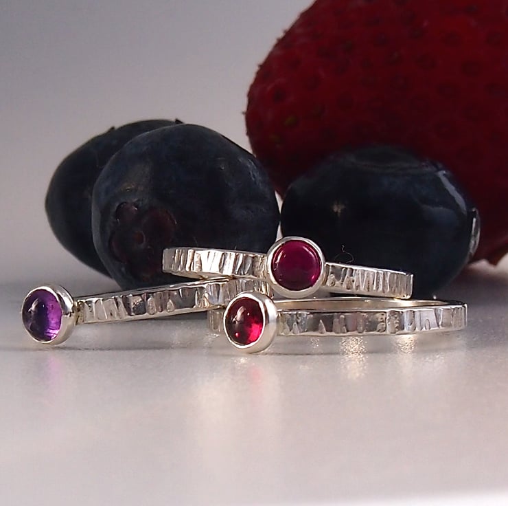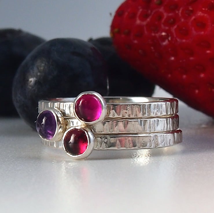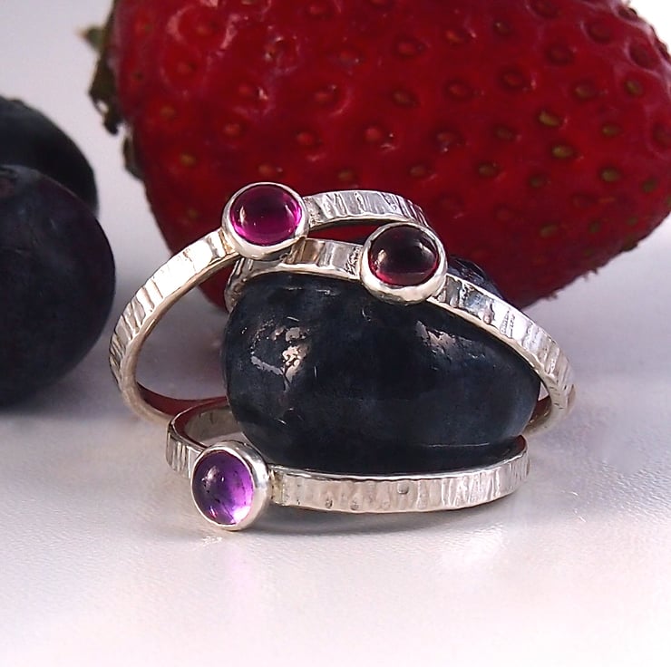 Three fruity semi precious stones set onto textured sterling silver bands. Glorious colours of amethyst, ruby and garnet. Three of your five a day!