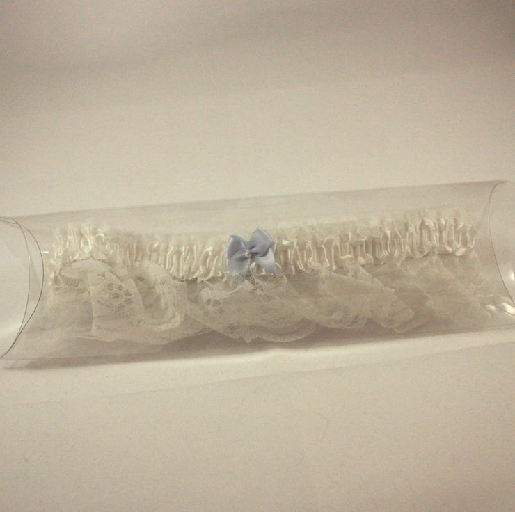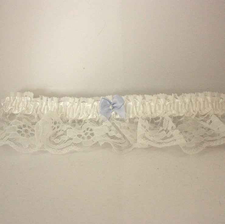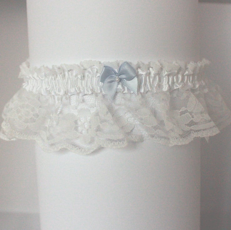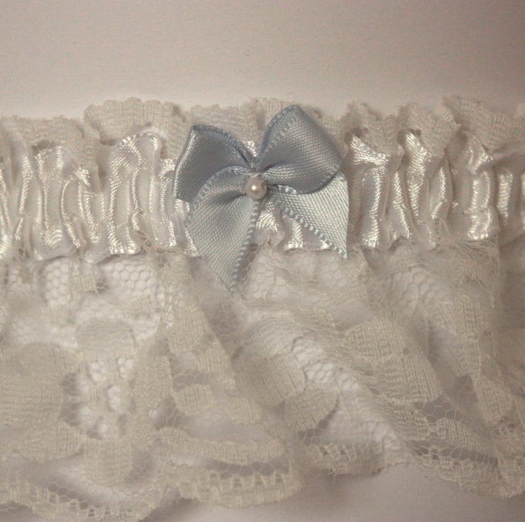 White lace wedding garter comprising pretty white lace with white satin ribbon. The garter is finished with your 'something blue' - a blue satin bow with a small faux pearl bead.