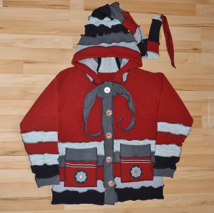 The jumpers are really soft and cosy, and have been carefully selected in complimentary colours. The bodice is a lambswool jumper. There is a long hood, 2 decorative patch pockets, neck ties and a button band closure, with matching wooden flower buttons.