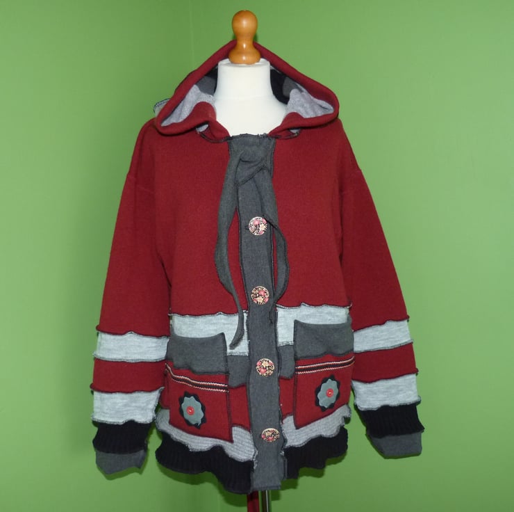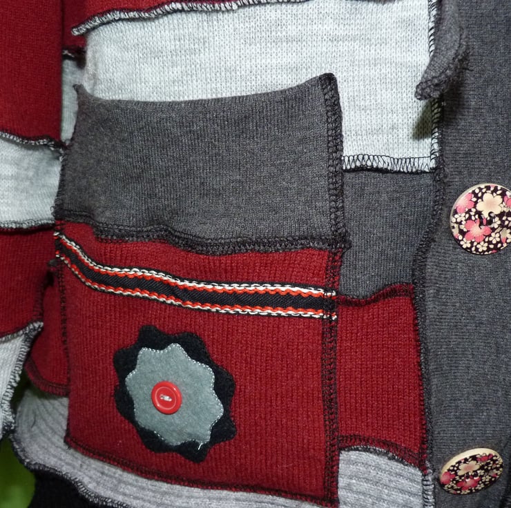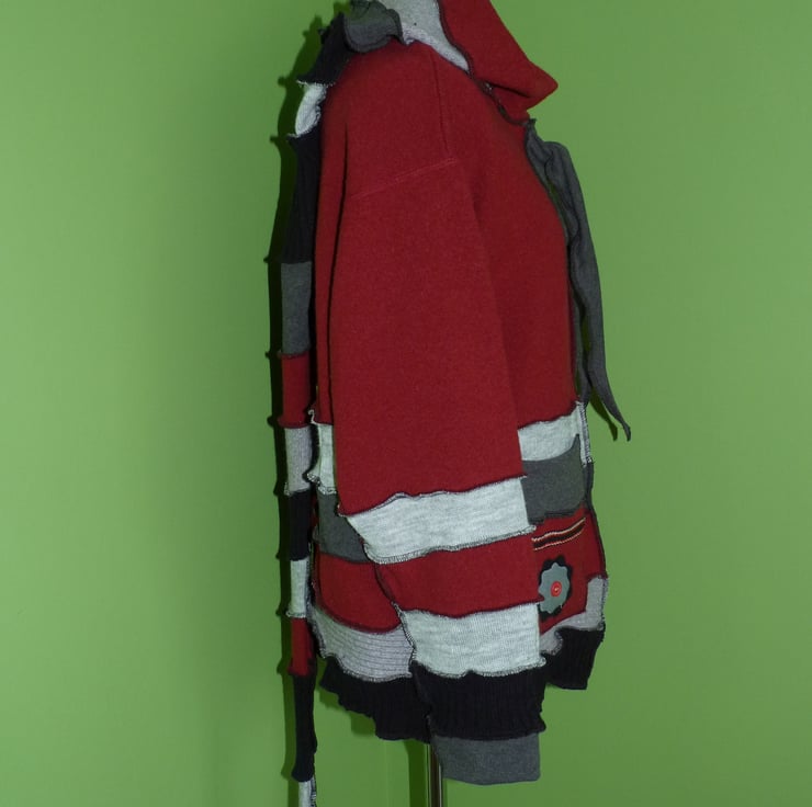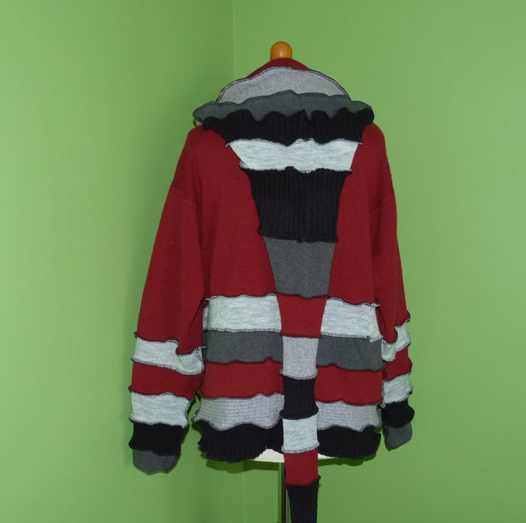 This fantastic up-cycled jacket is created from mainly wool jumpers. These are previously loved and recycled jumpers, that I have washed in a hot temperature and pre-shrunk. I have then cut and re-stitched the jumpers, with all seams being professionally finished with a serger/over-locker, to create this fabulous jacket.