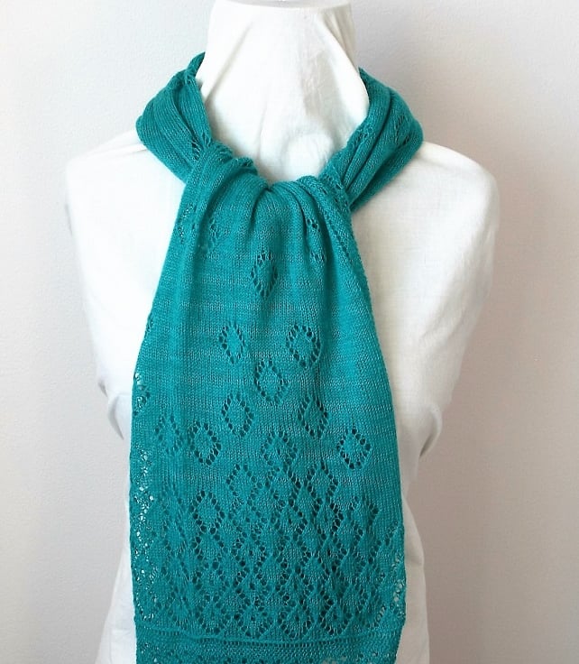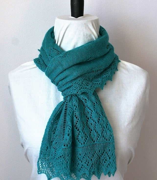 I have hand knitted the scarf in 1 ply merino yarn, which is spun in Italy. The high quality, luxurious yarn, produces a scarf that is wonderfully soft, light, and warm to wear.