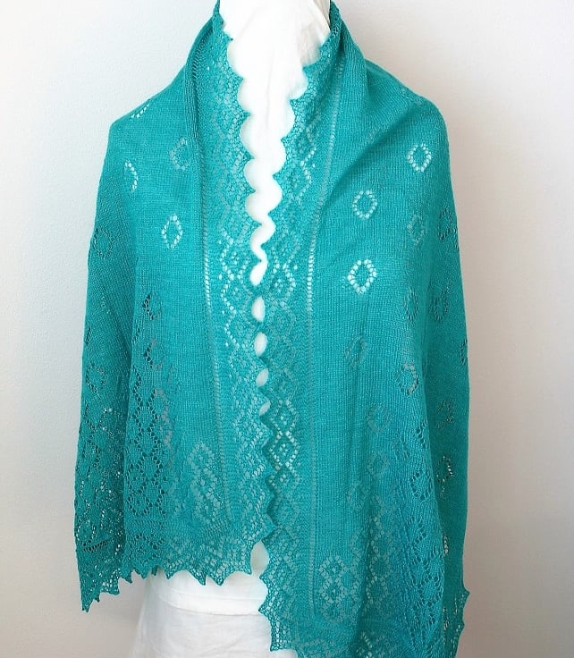 This Scarf/Wrap has been hand knitted to my own design in 100% merino wool. With lace patterning at the ends and a lace border the design is a more contemporary take on the traditional lace knitting. In the design I have utilised patterns and construction methods from the lace knitting traditions of Shetland and Orenburg.