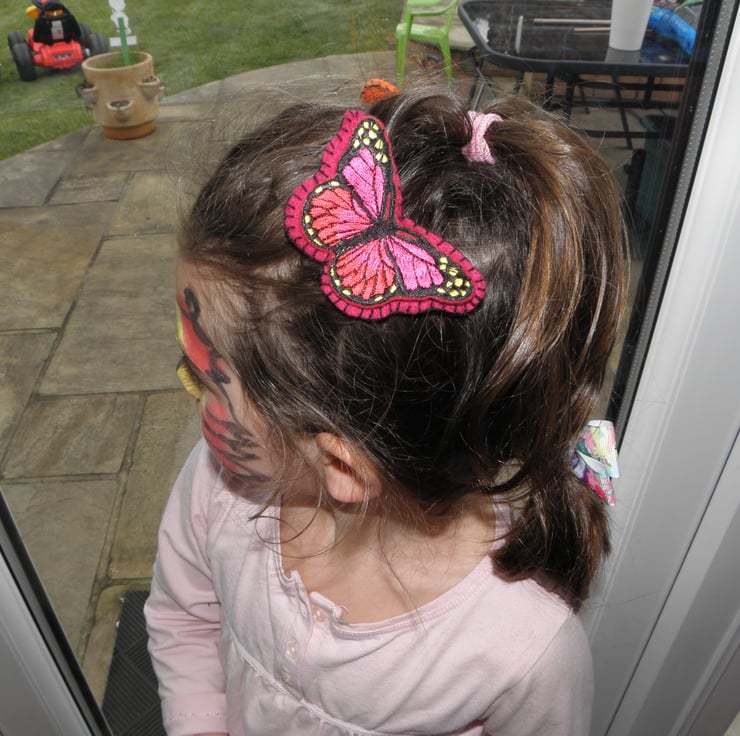 This beauttiful hair accessory looks stunning on both dark and fair hair alike. Measuring 7.5cm by 4cm, the iridescent butterfly is mounted on soft felt, and securely stirched to a 4cm non-slip alligator clip.