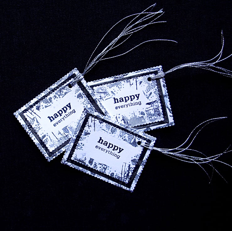 These handcrafted gift tags are made from layers of black and white card have been handstamped and heat embossed with 'silver' metallic powder. The sentiment 'Happy Everything' has been handstamped in black. The reverse side of each tag has 'silver' heat embossing to echo the design from the front. Finished with a silvery twine to attach the tag to your gift.
