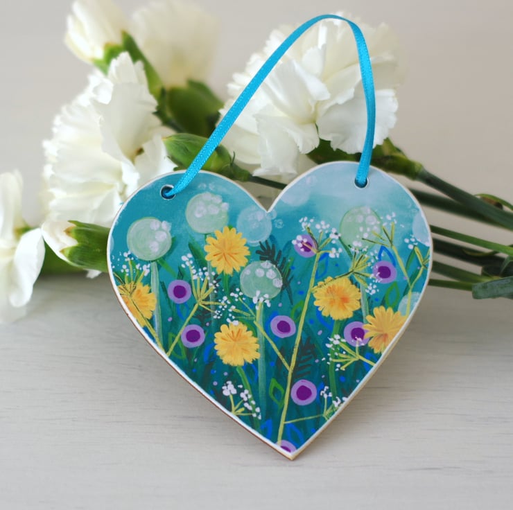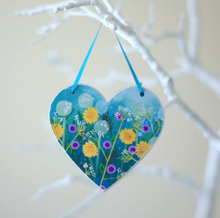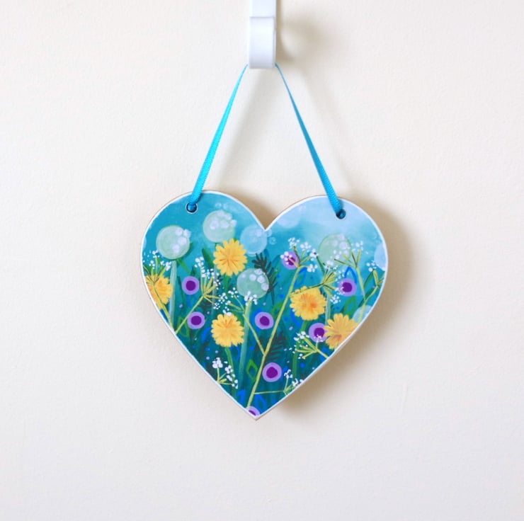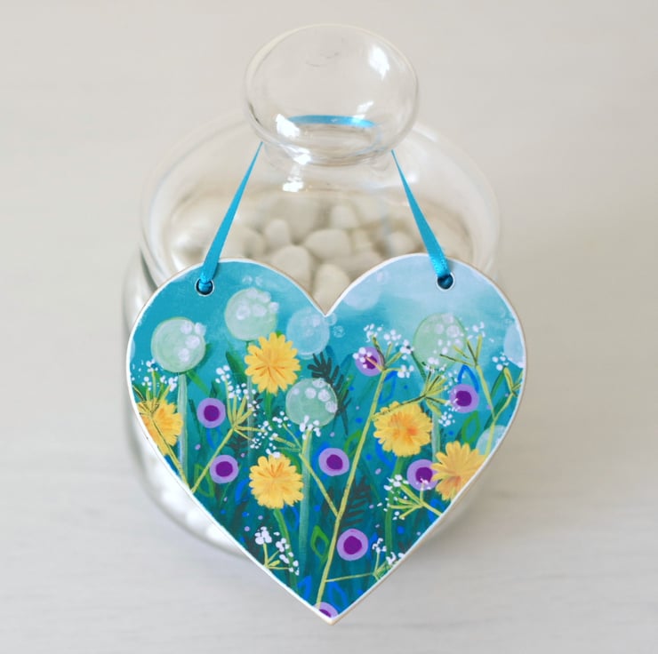 I made this turquoise hanging heart using a floral print after one of my original paintings, which I have mounted on a heart shaped plywood. The heart measures approx 4" (10 cm) across and it is 2mm thin. To be handled with care.