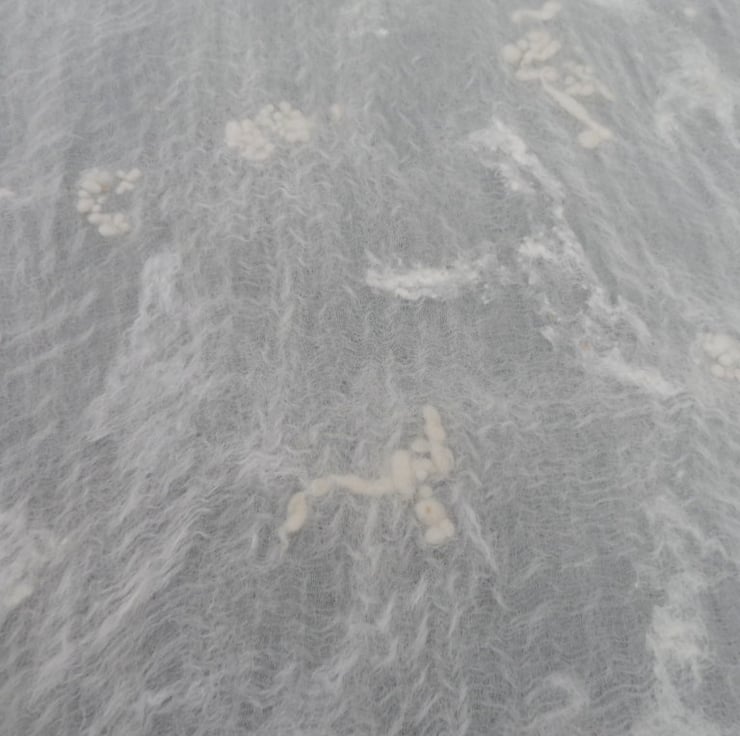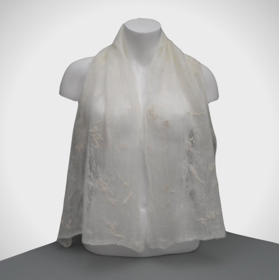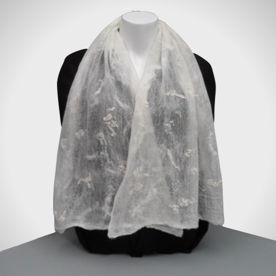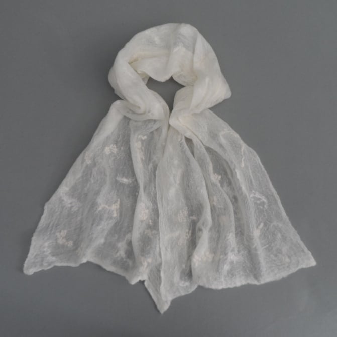 A beautiful and striking scarf. Weighing in at only 25g this super lightweight and sheer scarf has been made using a nuno felting technique. Various natural white (unbleached wool, cotton and silk fibres have been laid over a scream silk chiffon material and just enough unbleached white merino wool fibres to trap the inclusions have been added to both sides prior to felting.