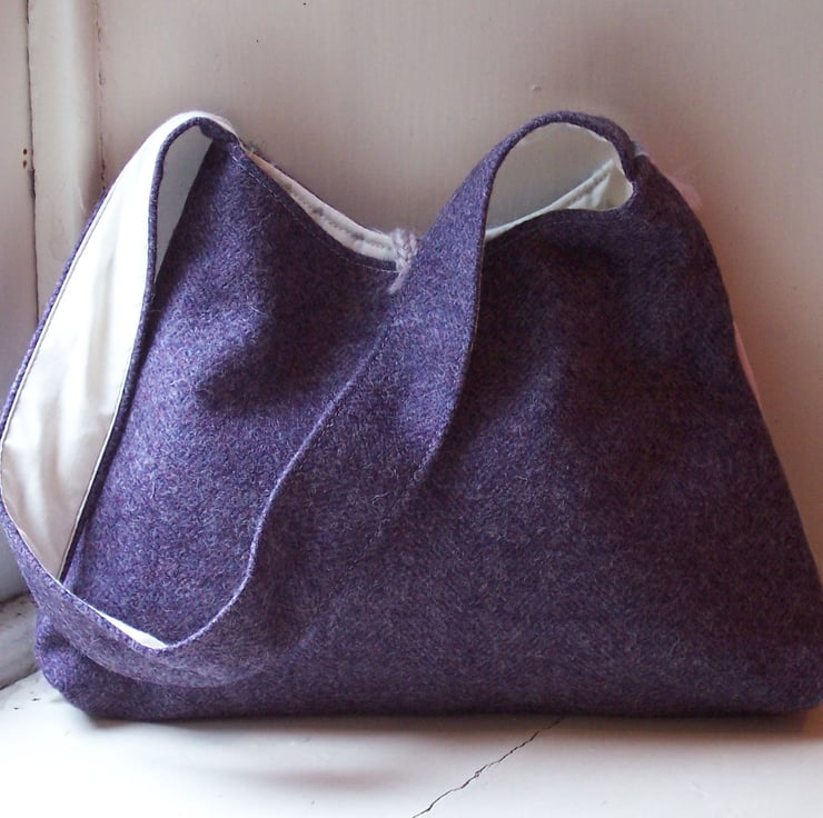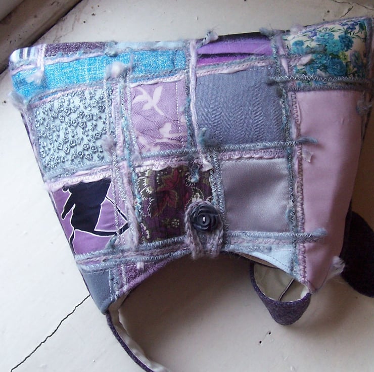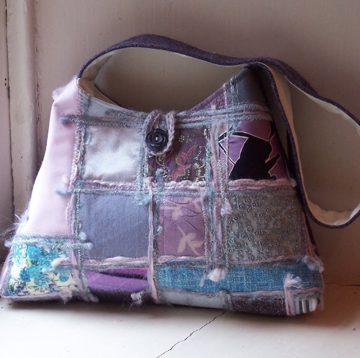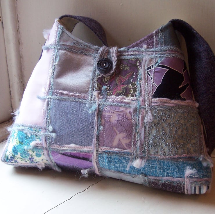 Fabric pyramid shaped bag in various soft duck egg blue, pink and lavender fabrics. Back and shoulder strap are in a beautiful heathery purple pure wool tweed, whilst the bag and strap are lined in ivory. This bag has a loop and vintage button fastening. The button is truly beautiful, shaped like a rose, in a soft grey blue colour.