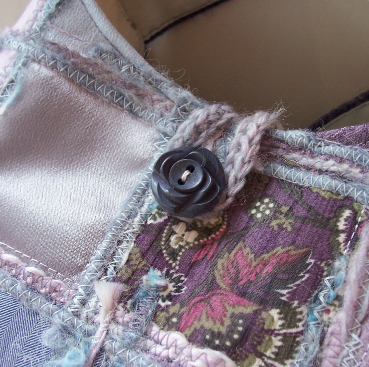 Front panel is built up with various layers of fabric appliques and couched yarn, combined with machine embroidery.