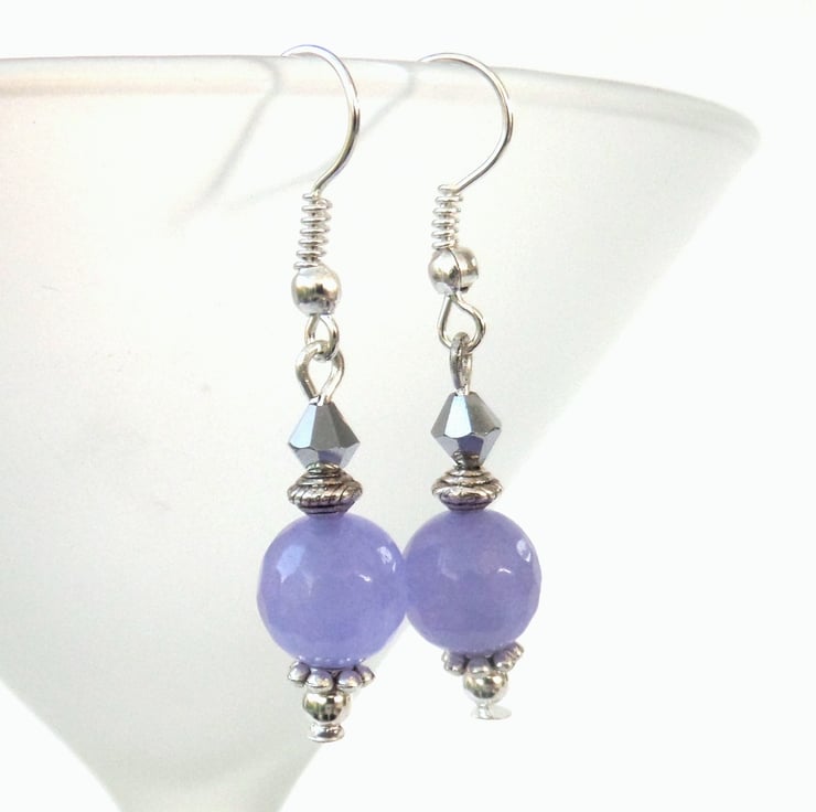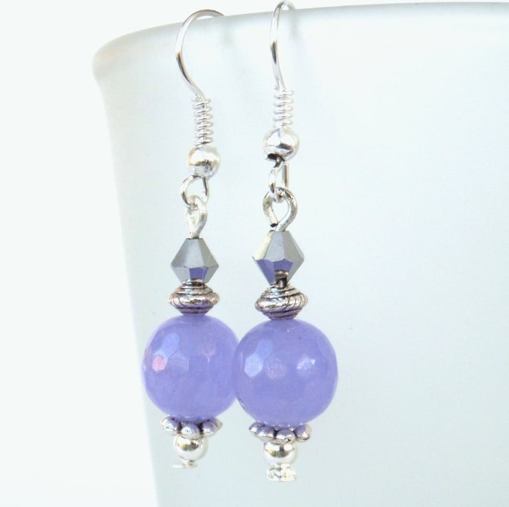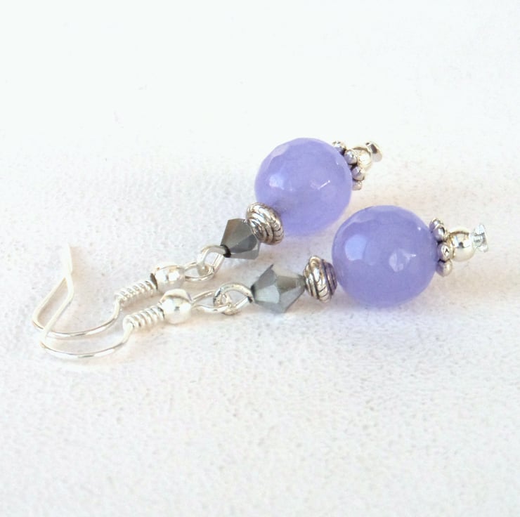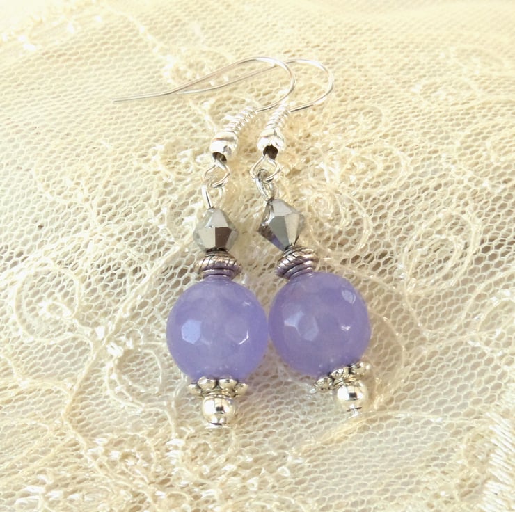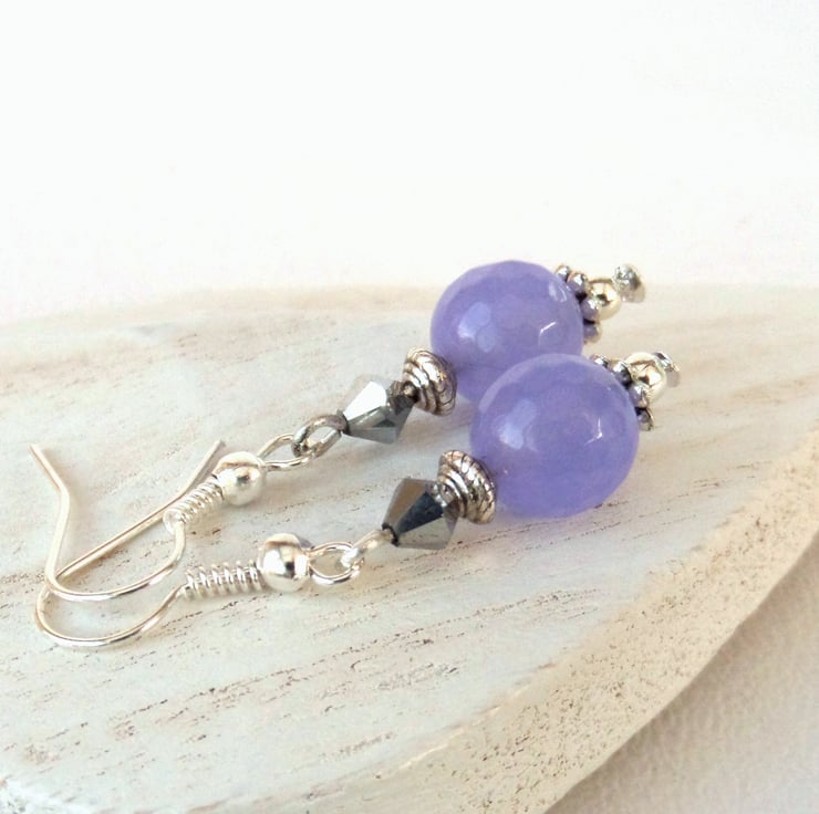 A dainty pair of handmade earrings, with lovely pale purple jade and silver crystals, hung from silver plated wires.