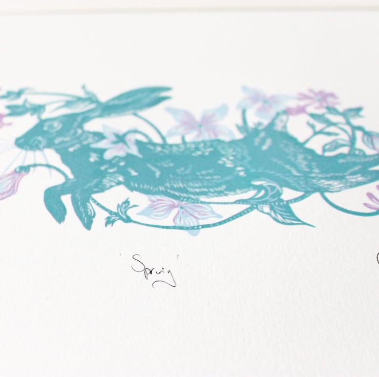 This print was inspired by the beautiful wild brown hare of the British countryside. I wanted to capture it leaping through the air, surrounded by wild flowers in a decorative garland.