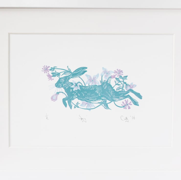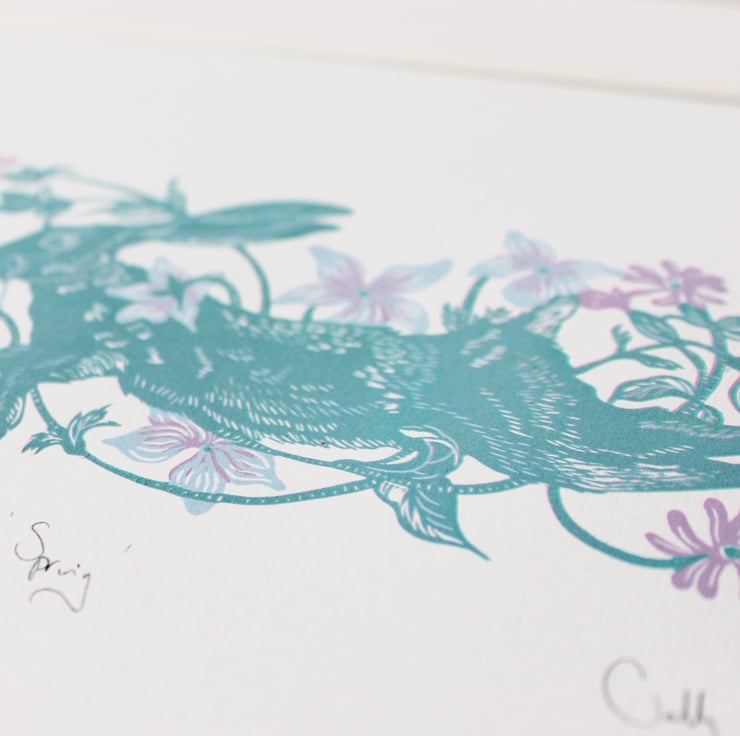 A hand carved and hand printed original linocut. Part of a limited edition, and only 1 available in this colour. Printed in three spring-like colours, in oil based ink on Fabriano Rosaspina archival paper.