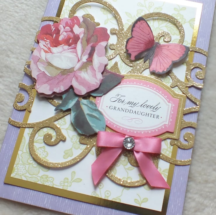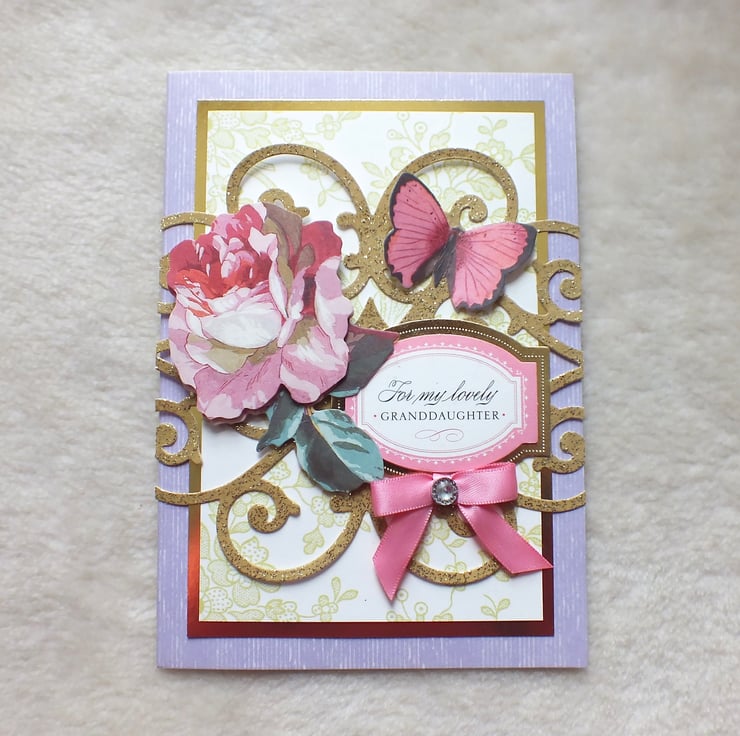A gorgeous 3D effect, collaged birthday card, handmade with Anna Griffin designer card stock, for a very much loved Granddaughter. Embellished with co-ordinating, die-cut ephemera, butterfly and satin bow. Approx. 5"x7" in size, and includes a printed insert with the sentiment, 'Wishing you all the best on your birthday and all year through.'