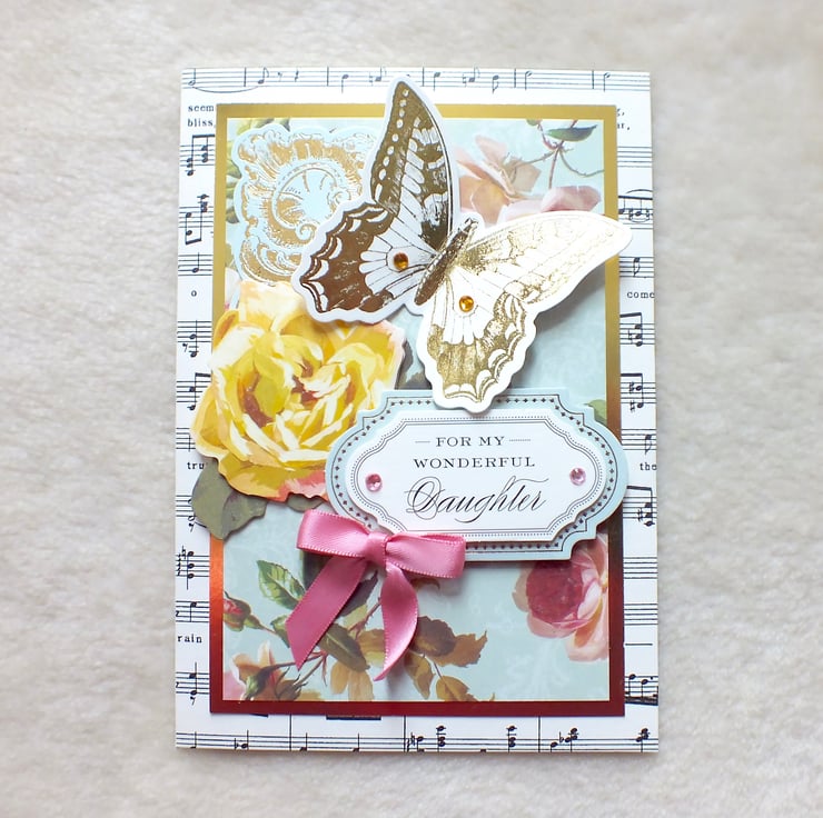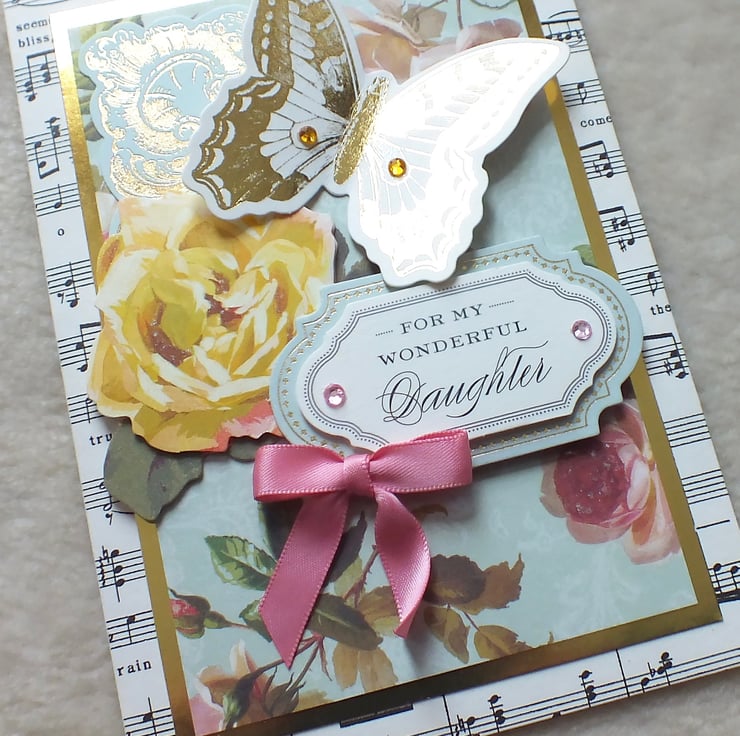 A gorgeous 3D effect, collaged birthday card, handmade with Anna Griffin designer card stock, for a very much loved Daughter. Embellished with co-ordinating, die-cut ephemera, gloriously large foiled butterfly, and satin bow. Approx. 5"x7" in size, and includes a printed insert with the sentiment, 'Wishing you all the best on your birthday and all year through.'