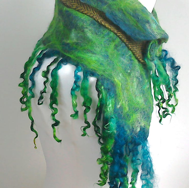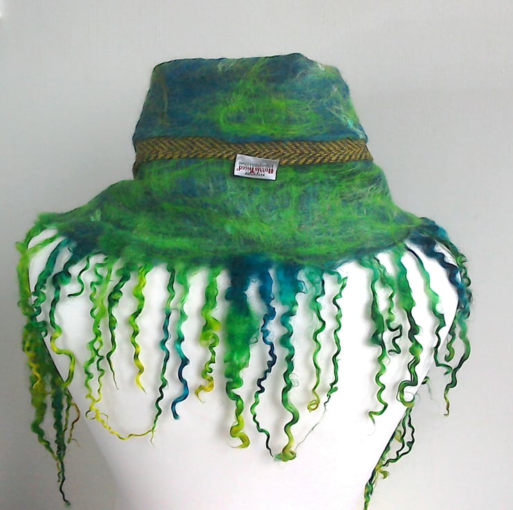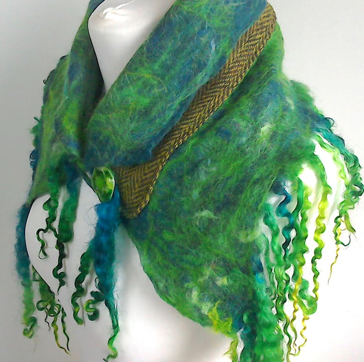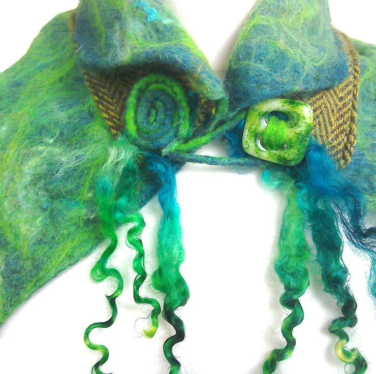 This unusual collar or scarf - shall we call it 'scollar'? - is made from soft merino wool, hand felted by me, with a band of fabulous Harris Tweed around the middle. The colour combination in the felt is a vibrant mix of greens, inspired by seaweed. The different shades of green blend beautifully and are complemented by the herringbone of the Harris Tweed. The soft curls of Teesewater locks make a striking curly fringe, giving movement to the scarf and remind me of the ropes of seaweed I saw on the shore. The fringe extends all the way round the scarf. A gorgeous handmade glass button, from fellow Folksy seller Heavenly Anarchist, which fastens with a felt loop adds a very stylish finishing touch.