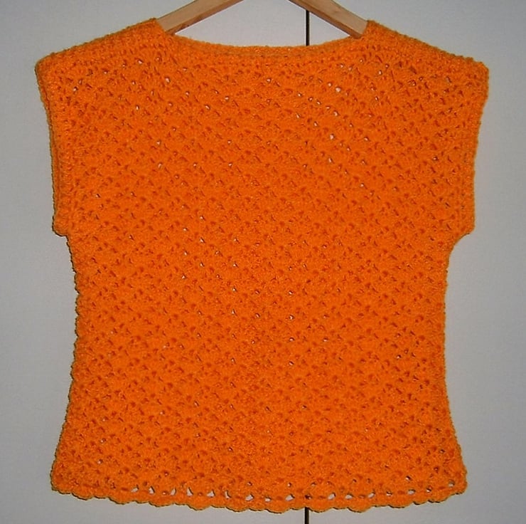 this lovely lightweight hand crocheted lacy summer jumper has been created using a lovely orange 4ply acrylic yarn.