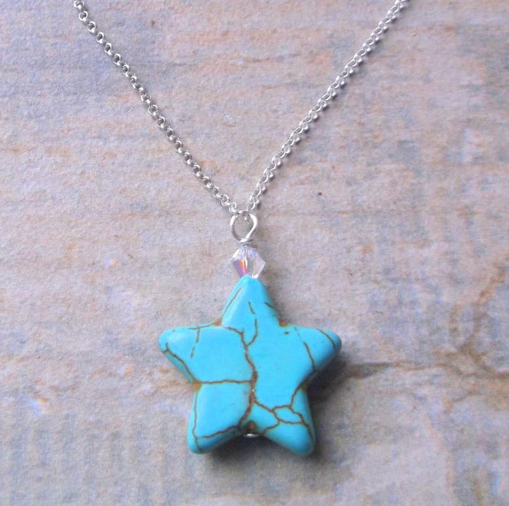 Turquoise Star with a Clear Ab Swarovski crystal Pendant, . With either a 16 inch sterling silver chain or a 18 inch sterling silver chain. Free gift box tied with ribbon