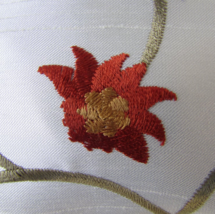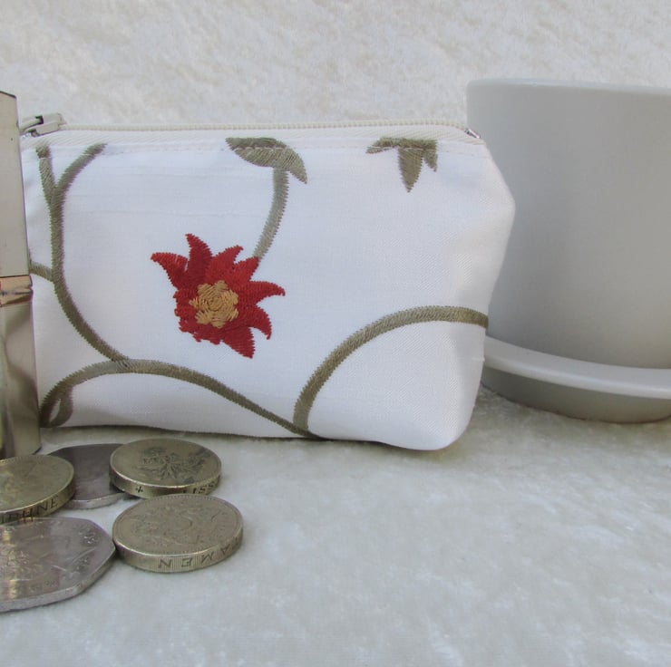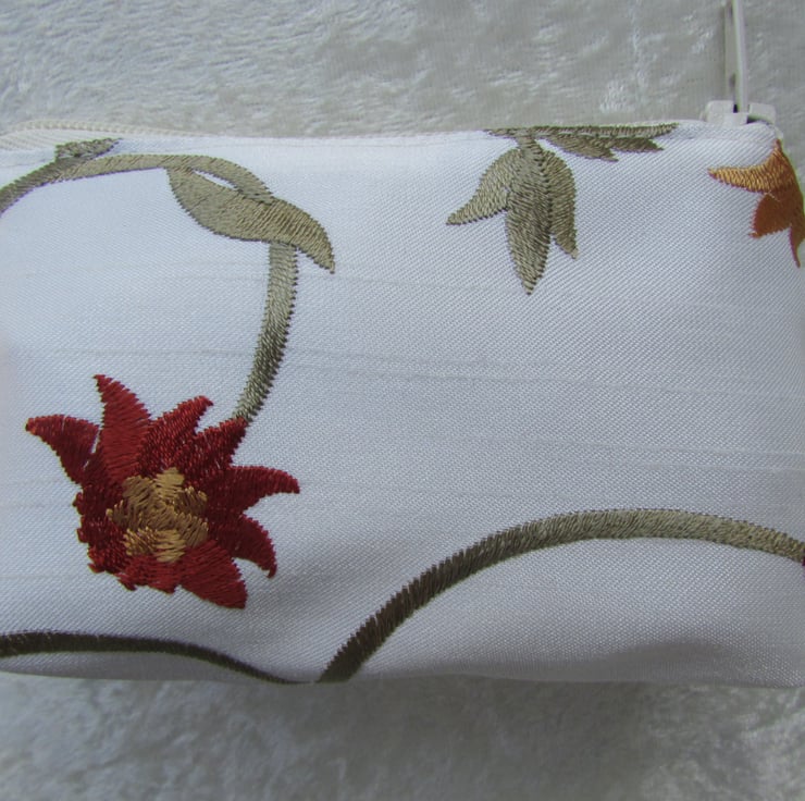 A pretty little purse in a luxurious ivory satin-finish fabric with an embroidered twining floral pattern in orange, golden yellow and sage green. The purse has a zipped fastening and is fully lined with cream fabric. The base of the purse is boxed to give extra space inside.