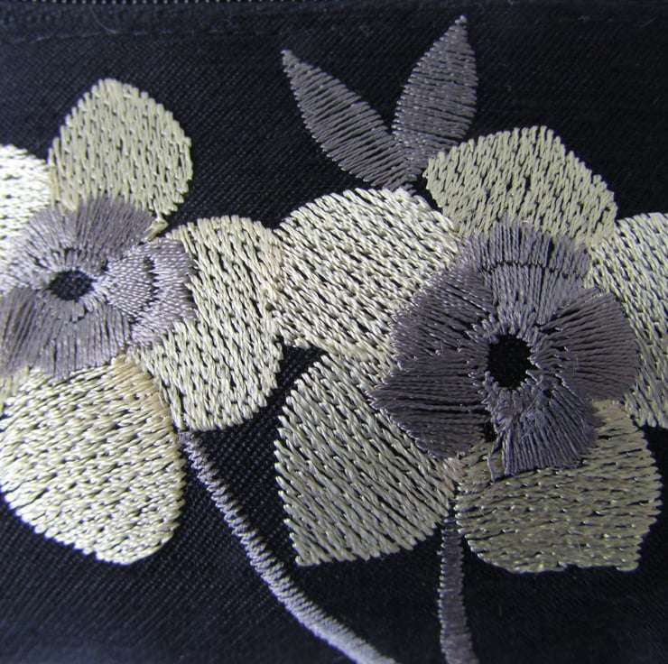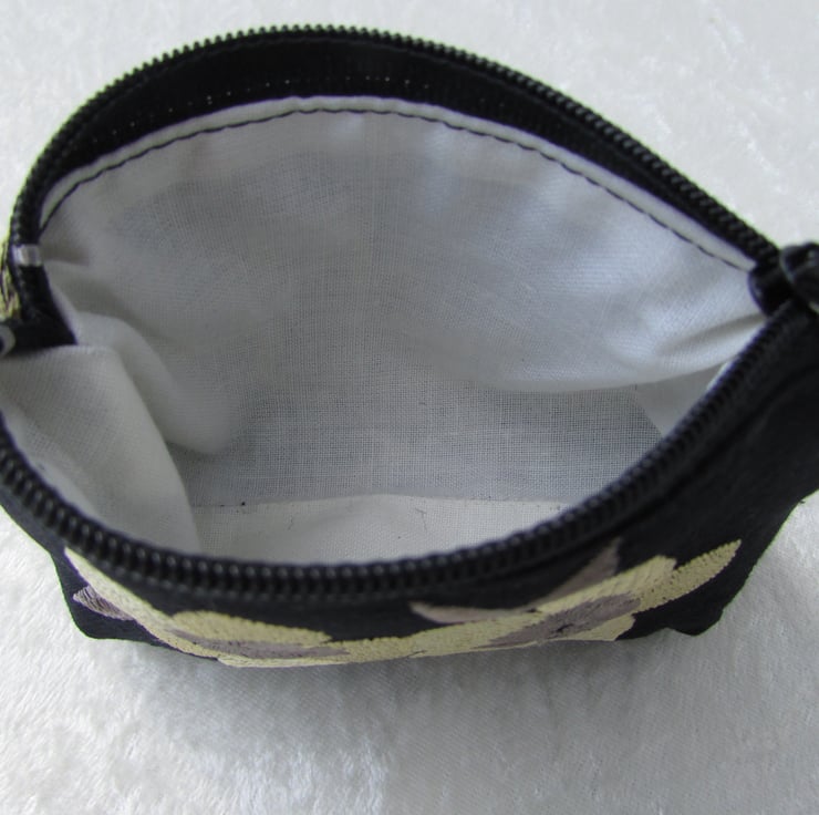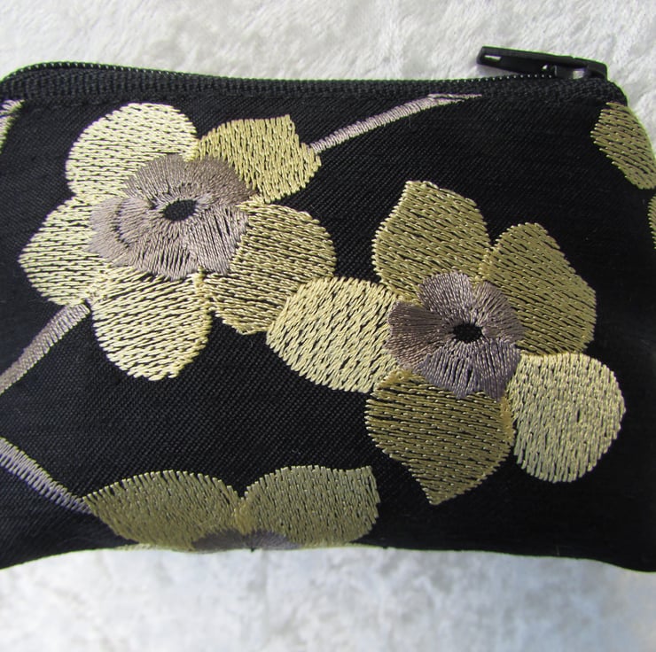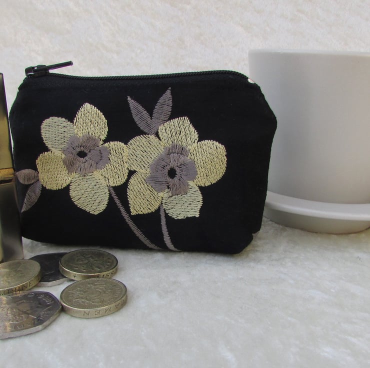 A stylish little coin purse in a lovely black fabric with an embroidered pattern of flowers in pale yellow and grey. The purse is lined with cream fabric and has a black zipped fastening. The base of the purse is boxed to give more room inside.