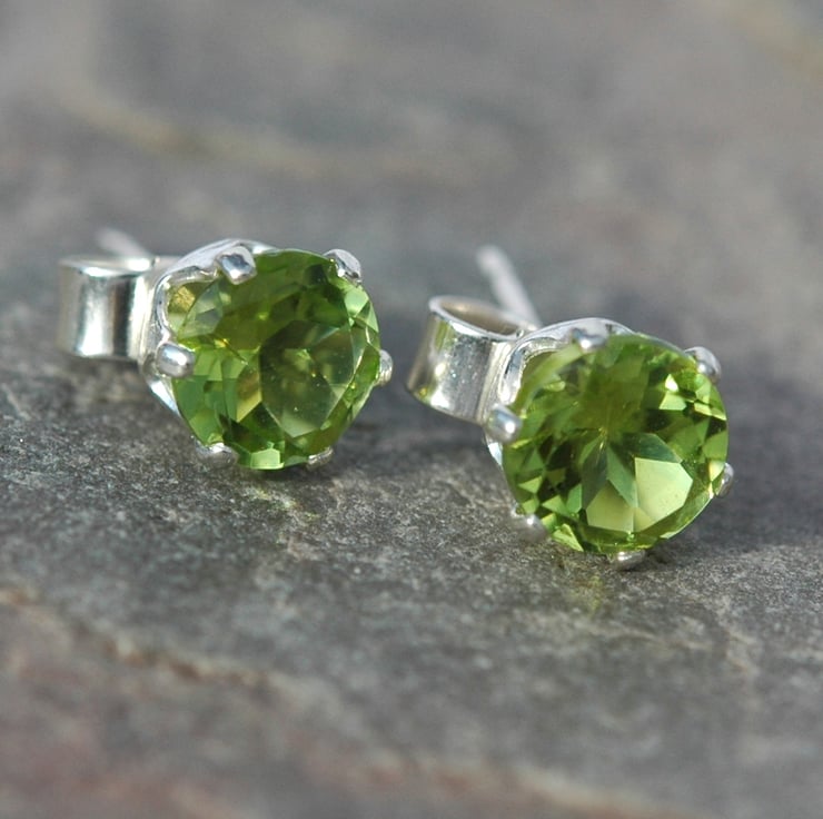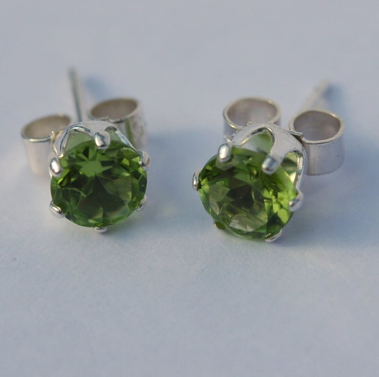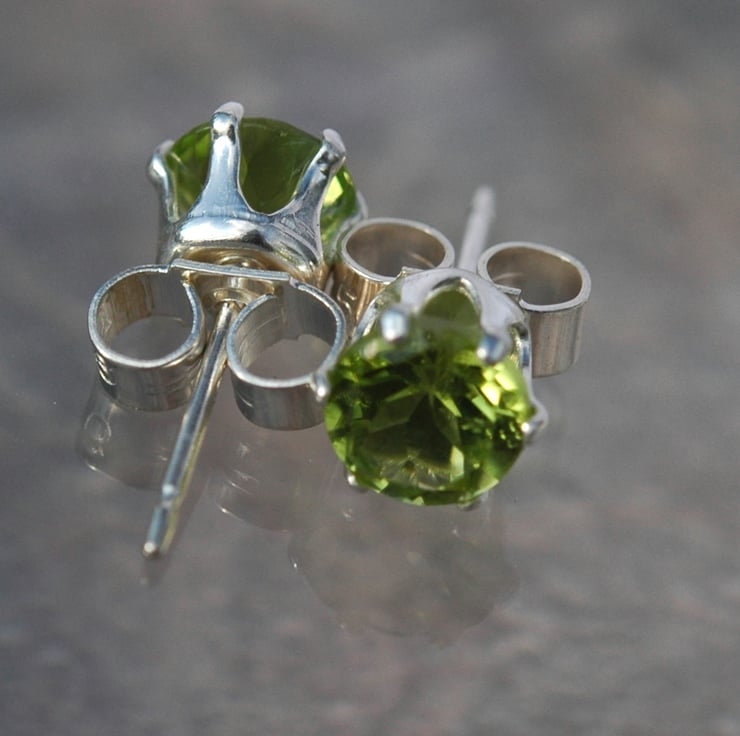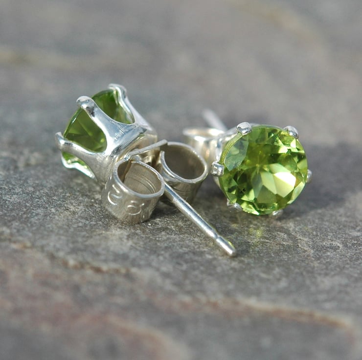 These gorgeous sterling silver stud earrings feature light green peridot gemstones, the birthstone for August. The rose cut stones are hand set in sterling silver 6-claw settings with ear posts and butterfly scrolls. The stones are 5mm in diameter so easily visible from a distance. They have a wonderful clarity and sparkle. The butterfly scrolls are stamped '925', indicating the purity of the silver.