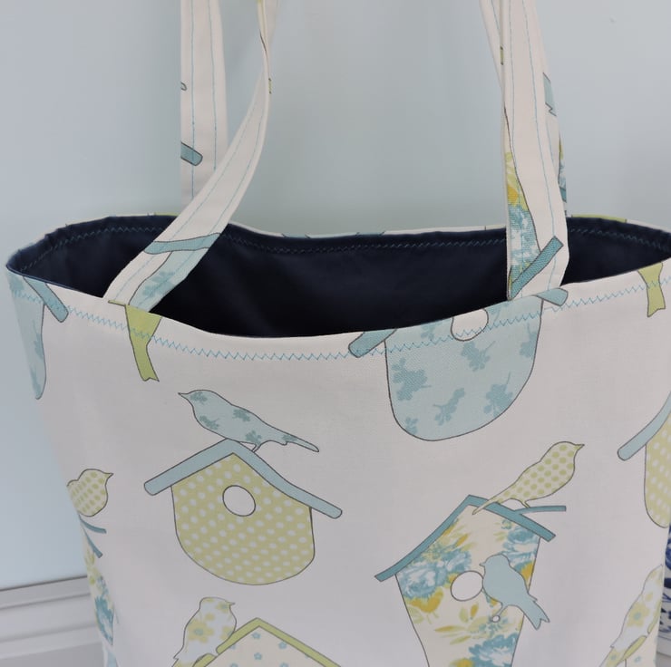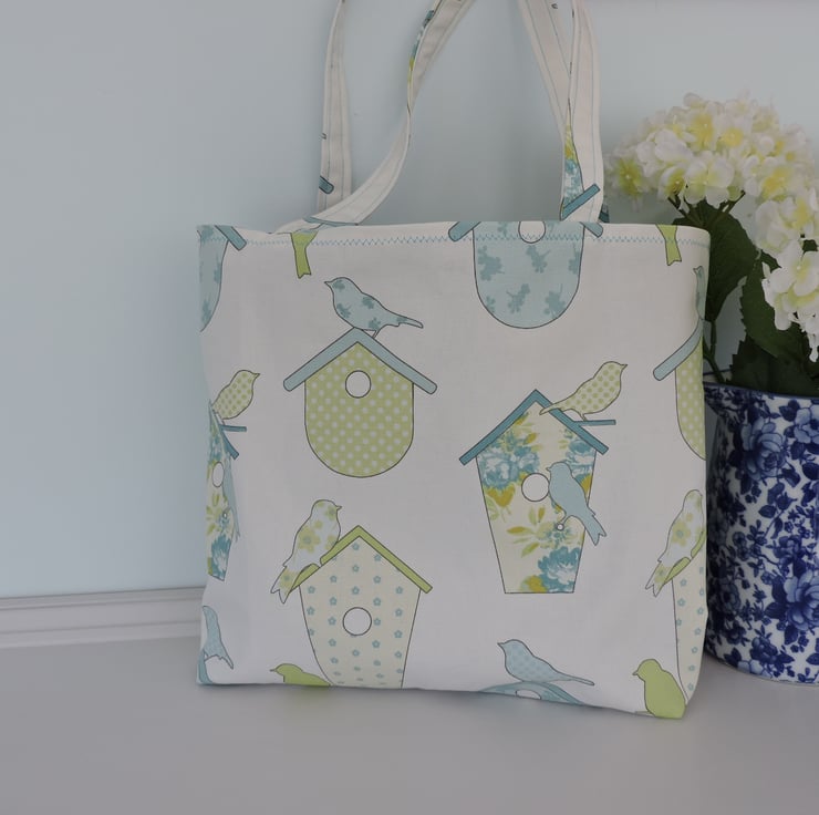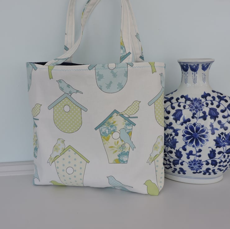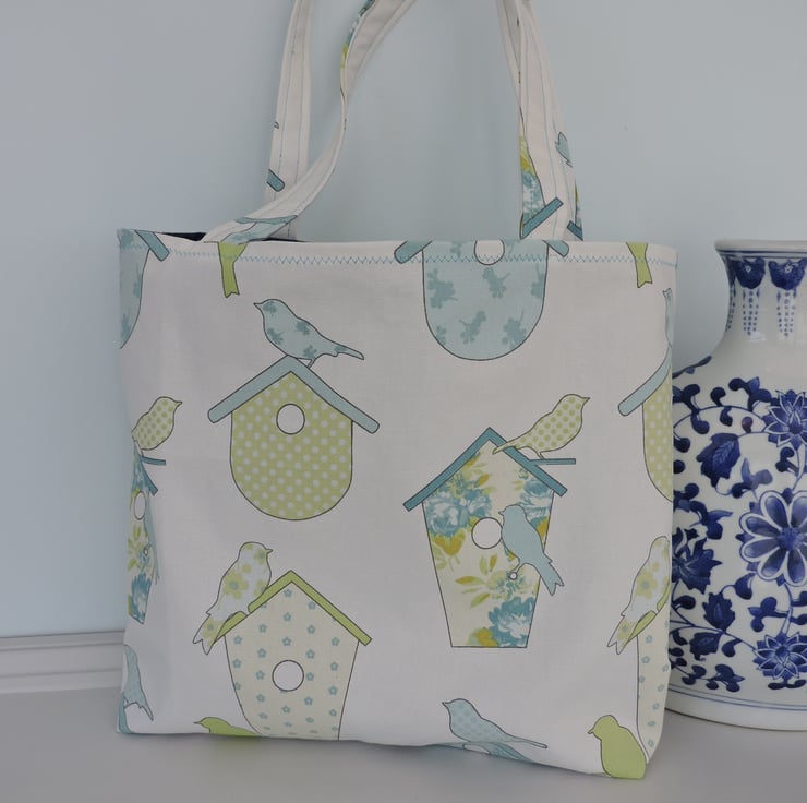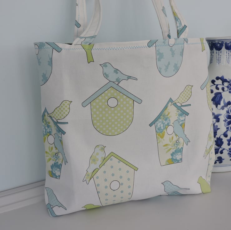 I've made this tote bag, shopping bag from a white linen fabric with pale aqua and lime birds and birdhouse. It has a squared off bottom and is fully lined in a mid blue cotton fabric.