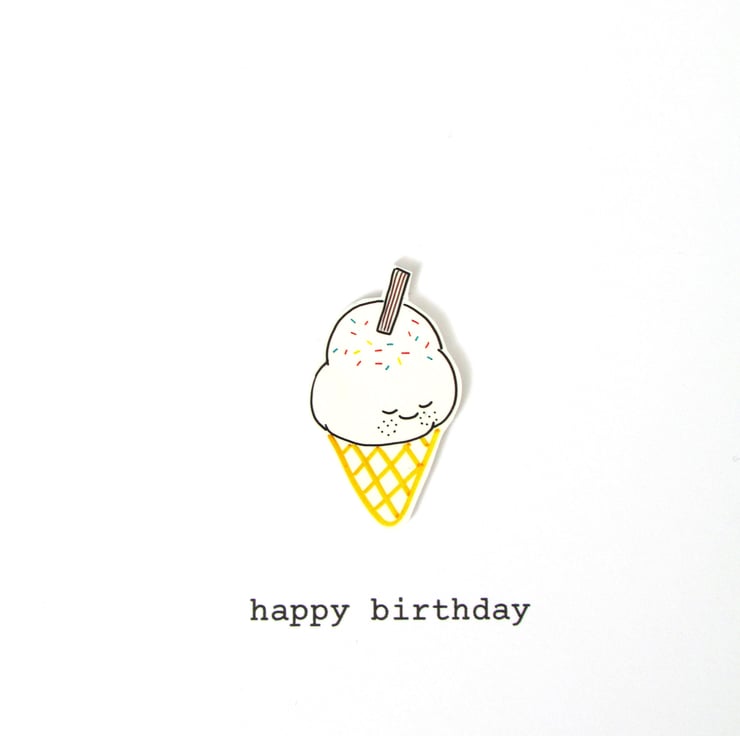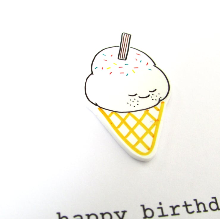 The ice cream cone has been hand drawn on to white shrink plastic and varnished. On an A6 white card with envelope.