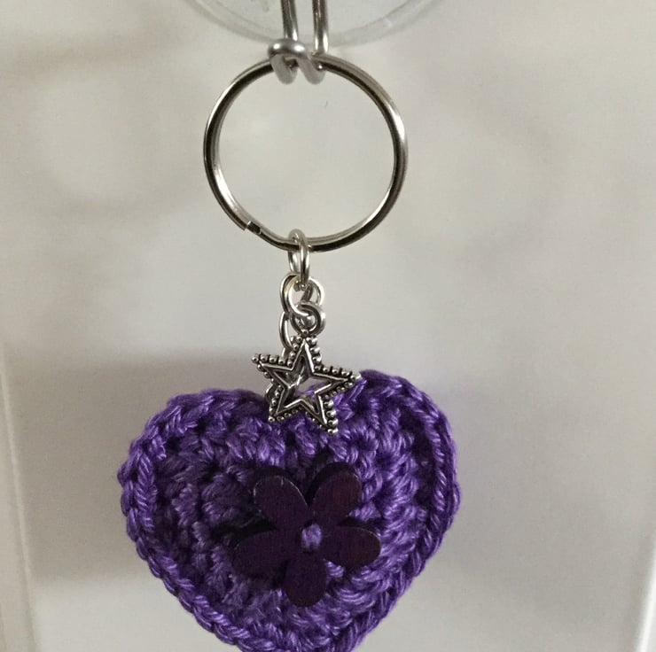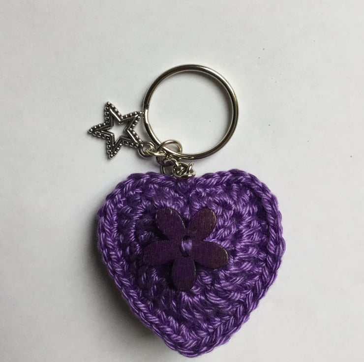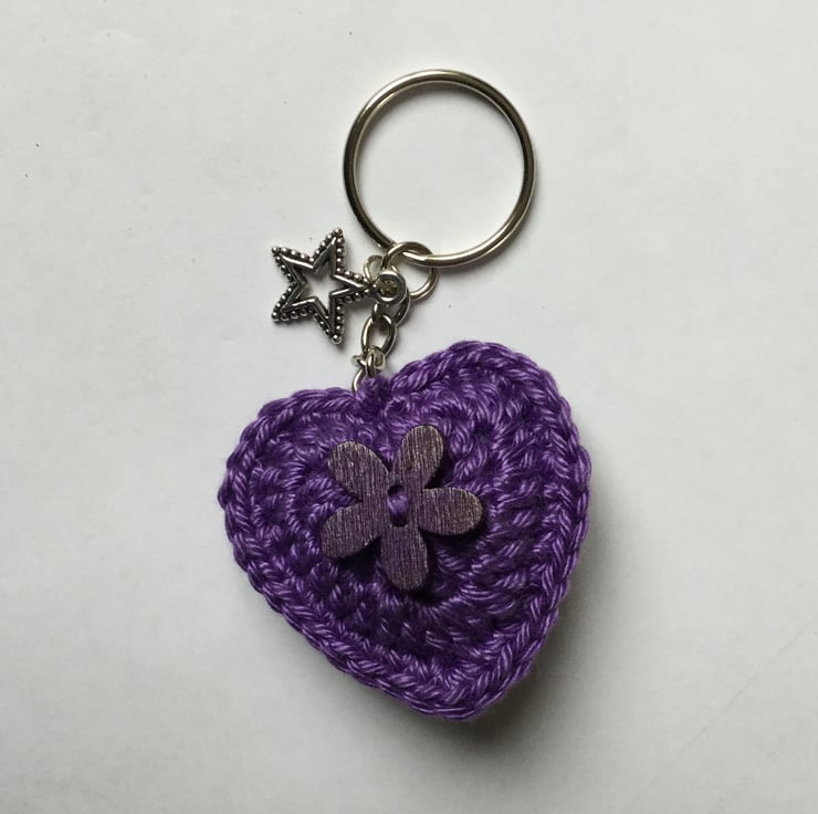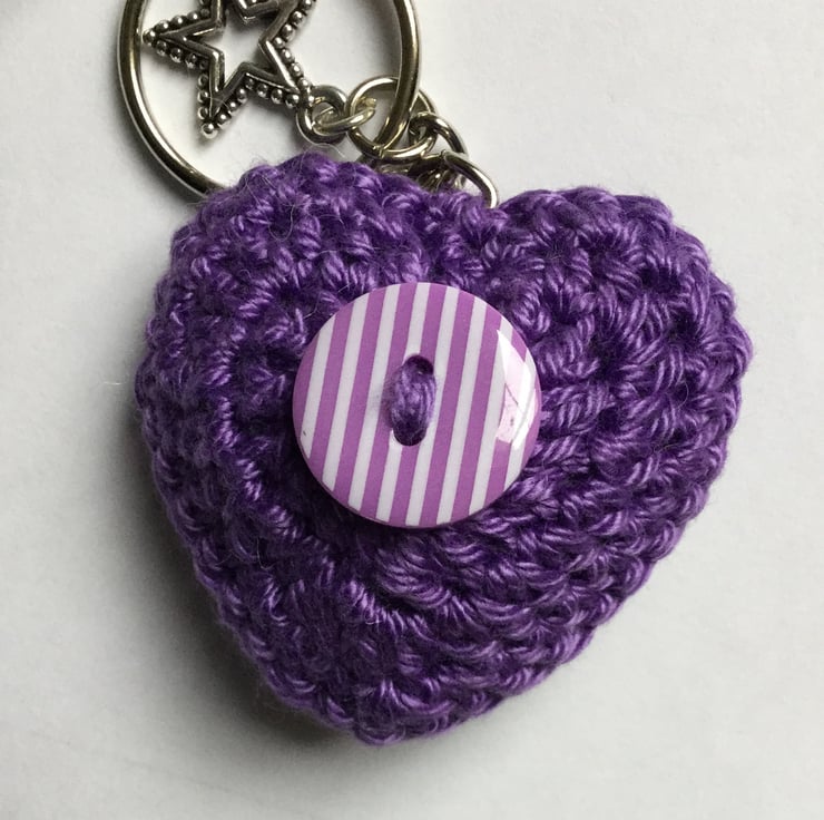 This little heart has been crocheted in a 100% cotton yarn in purple. There is a small amount of toy stuffing inside and has been decorated with a purple and white striped plastic button on one side and a wooden flower button on the other.