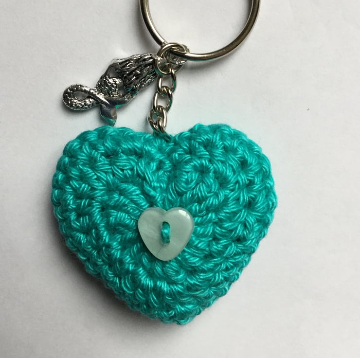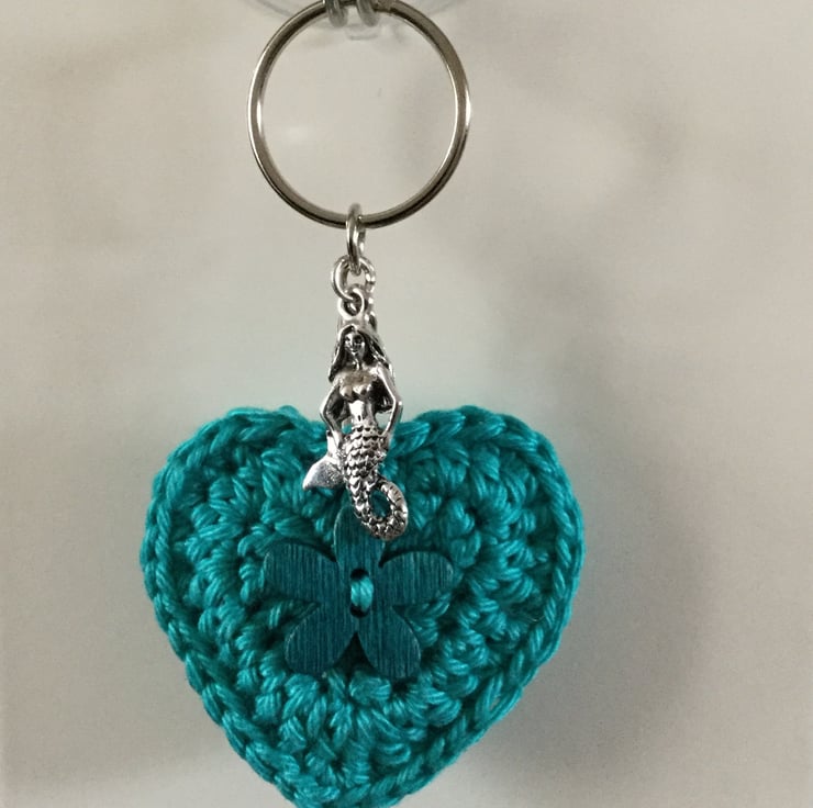 The heart measures 2"x 2" (5cm x 5cm) it is hanging on a short piece of chain from a keyring together with a Tibetan silver mermaid charm making a total length of 3.5" 9cm