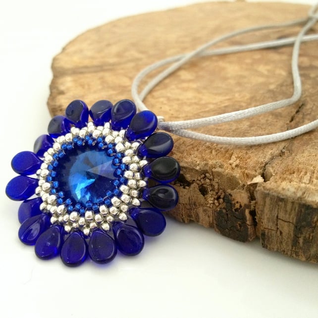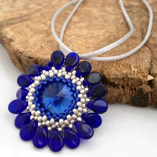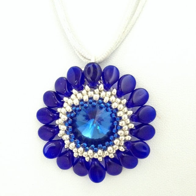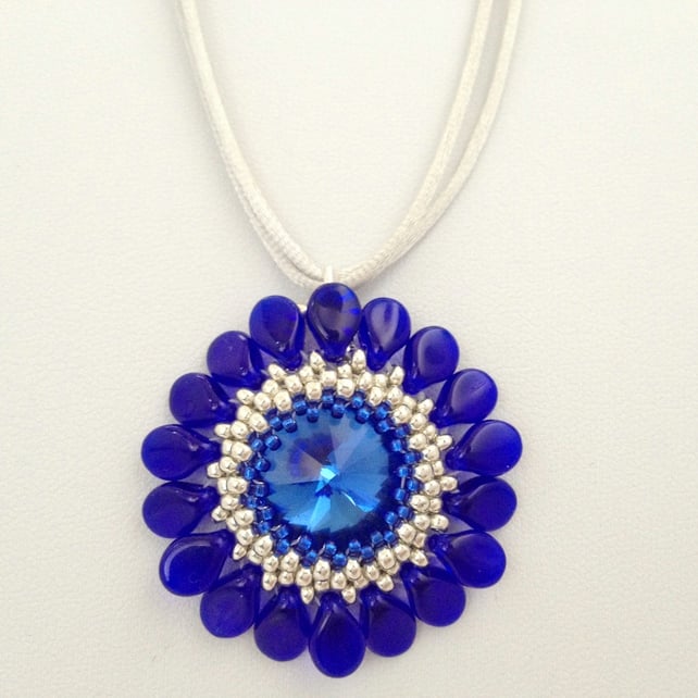 The pendant features a 16mm crystal encased by seed beads at its heart, with the addition of pip beads to create the petals. All the beads have been hand sewn together to create this delightful pendant.