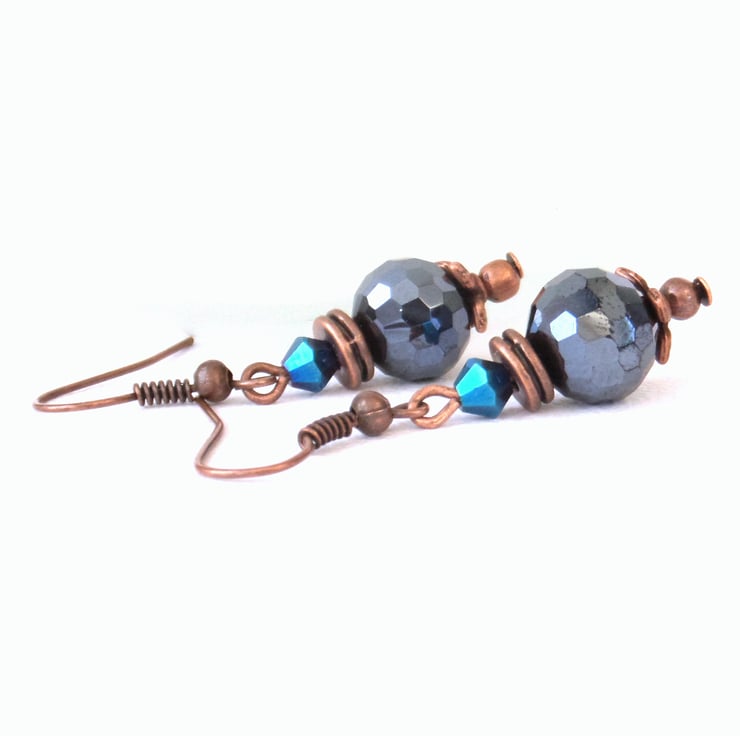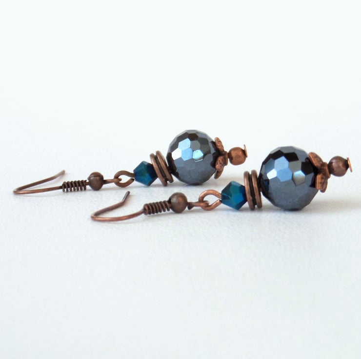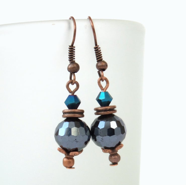 A great combination of jet crystal and vivid blue crystals hanging with copper beads and beadcaps from copper wire creates these sparkly and rather lovely earrings.