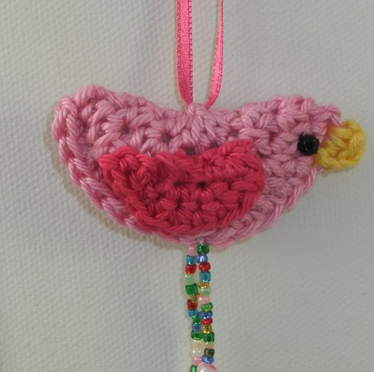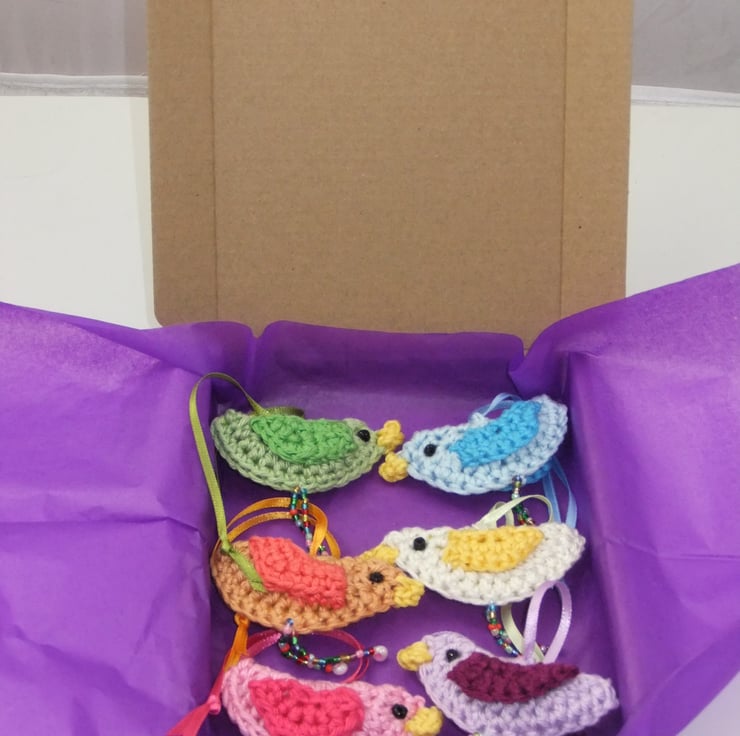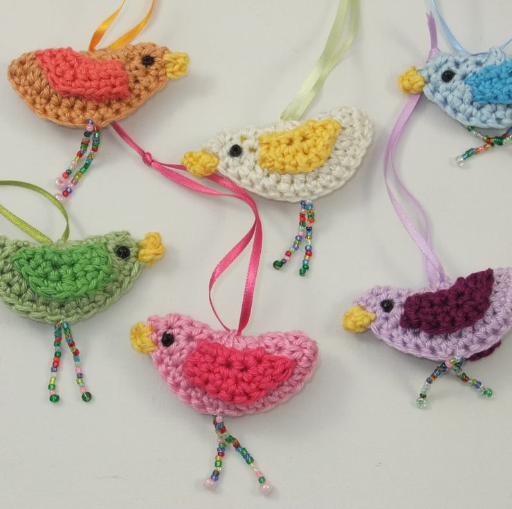 These tiny bird hangings will bring some cheer to any room! They are perfect for hanging from a decorative tree or a real branch (brought indoors) or even from an indoor pot plant such as a weeping fig. They are crocheted in cotton and have a felt lining. They have been lightly filled with polyester stuffing. They have dangly legs made from threaded glass beads and black glass beads for eyes. The hangers are made from narrow satin ribbon. Each little bird measures approximately 6 cm (beak to tail end) x 5 cm (where ribbon joins to tip of the toes!)