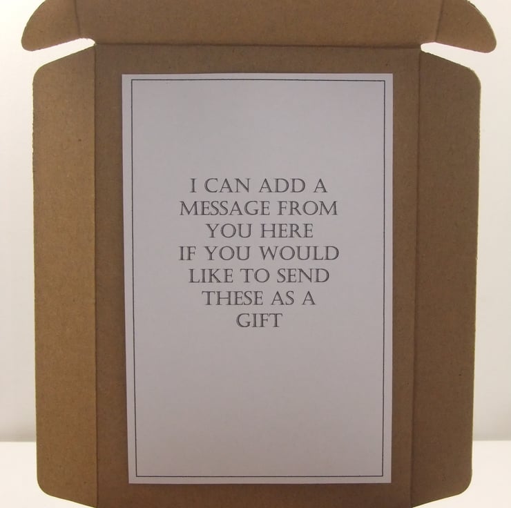 I am very happy to add a printed message (on brown kraft or white paper) to the inside lid of the box so that the birds can sent as a keepsake gift and greeting in one and an alternative to a greetings card!