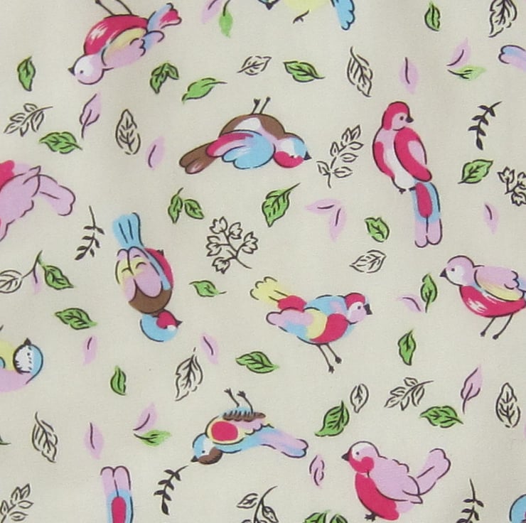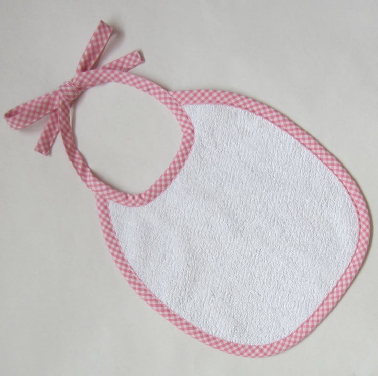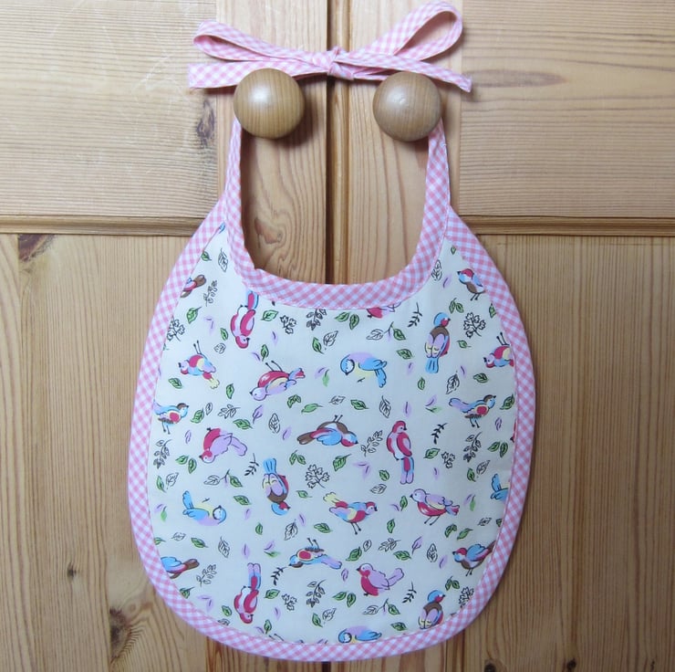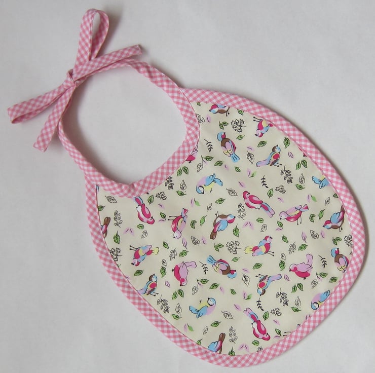 Small babies bib in a pretty bird fabric, edged in pink gingham check and backed with white towelling. Suitable for a baby aged 6 to 12 months. It measures 26 x 23 cm. Ties with a bow at the back of the neck for a good fit.