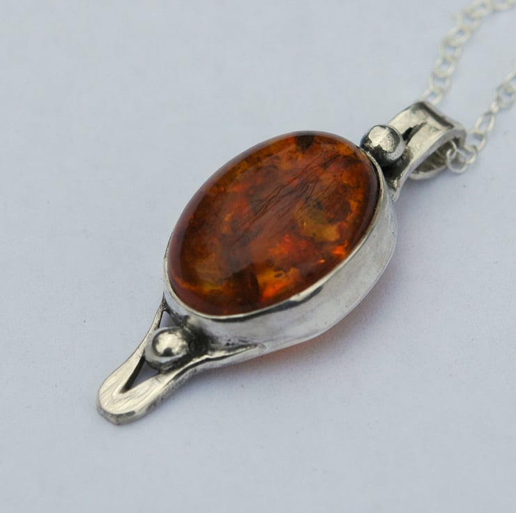 This elegant pendant features a beautiful large amber cabochon, 18x13mm, in a handmade silver setting. For the setting I have used sterling silver bearer wire, open at the back to allow light to shine through and reveal the fascinating inclusions in the amber. I have decorated the top and bottom with 4mm wide sterling silver wire which has been cut into a V-shape before soldering it to the setting and adding handmade silver granulations. The top section is longer and has been curled back to form a bail which is attached to a sterling silver trace chain.