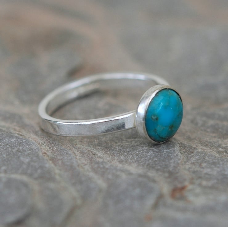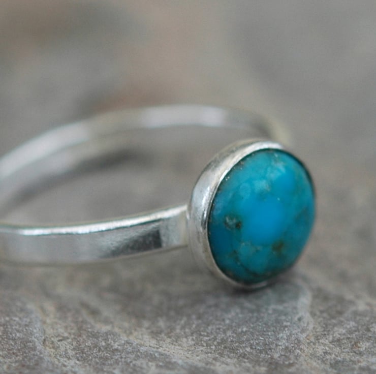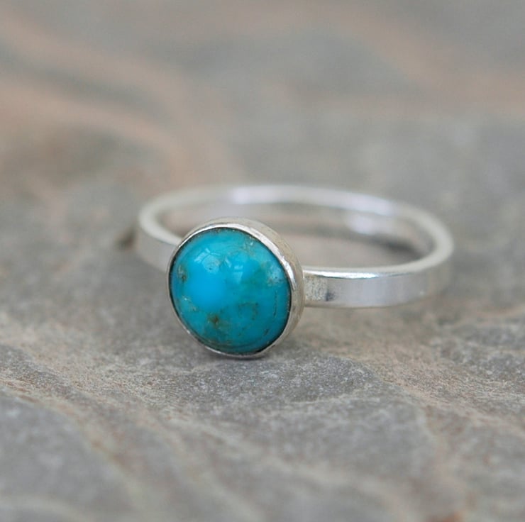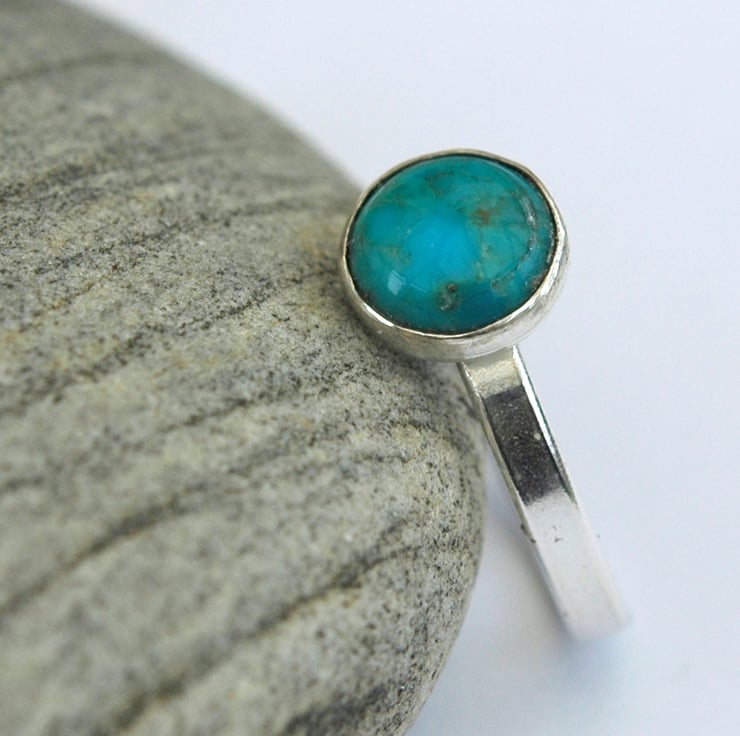This delightful sterling silver ring features a round cabochon of turquoise, 8mm in diameter, mounted on a ring shank made from rectangular wire 2.5mm wide. The stone sits in a silver bezel cup firmly soldered to the ring. Traditional silver hallmarks, including my own maker's mark, have been applied by the London Assay Office. The ring is currently available in size N. This is a useful piece of jewellerry that is equally at home in casual or formal settings. It would make a great gift. It will be packaged in a smart gift box and sent by Royal mail first class post.