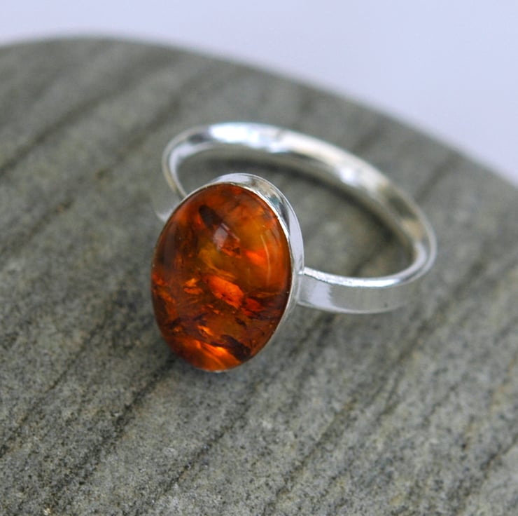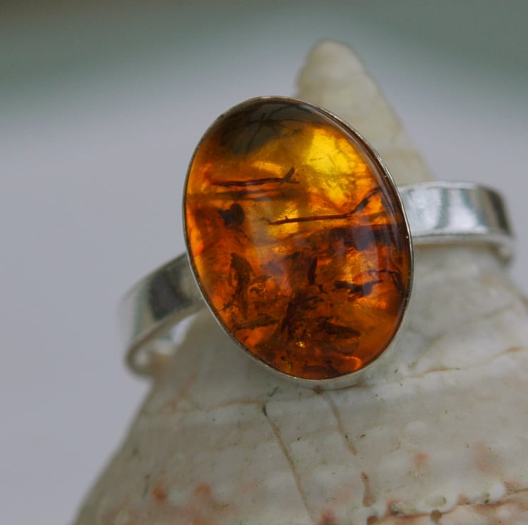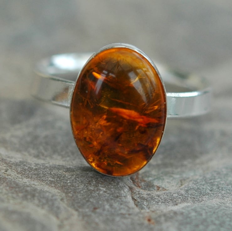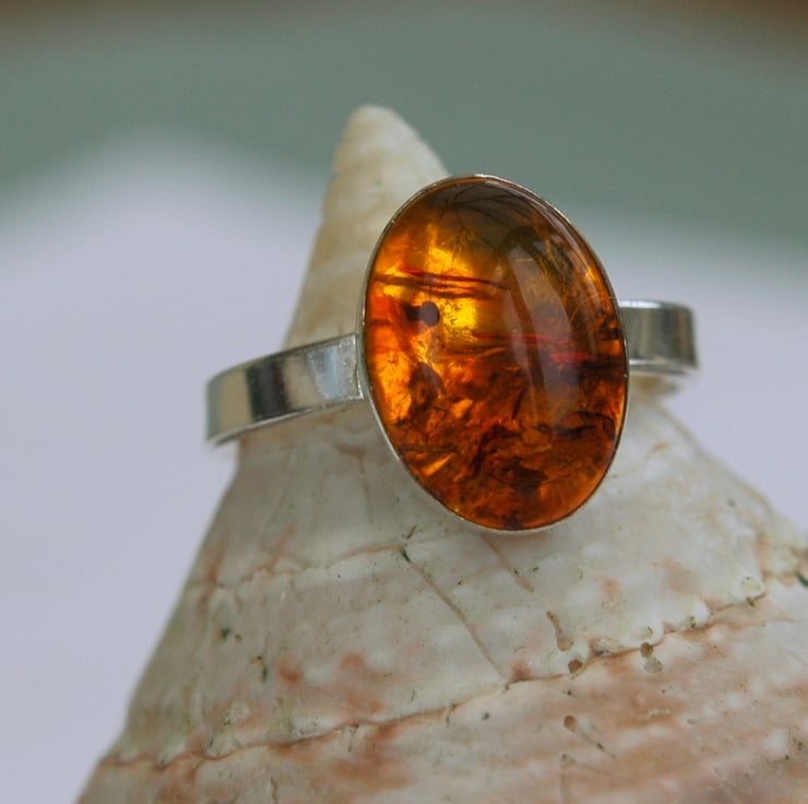 Grab a bargain with this beautiful sterling silver ring which is a slight second. The stone is very slightly askew, by about 5 degrees from the vertical. This is barely noticeable and not apparent at all when it is worn. To compensate I have reduced the price by about half. The ring features a large oval cabochon of natural Amber, measuring 14x10mm, with a unique assortment of sparkling inclusions. It is set in a sterling silver bezel cup, soldered to a D-shaped ring shank 3.2mm wide with the curved surface facing inwards, which makes it particularly comfortable to wear and easy to put on or take off. On my ring gauge, this ring comes midway between O and P, so it should fit either size. The ring will arrive packaged in a smart gift box, sent by Royal Mail first class post.